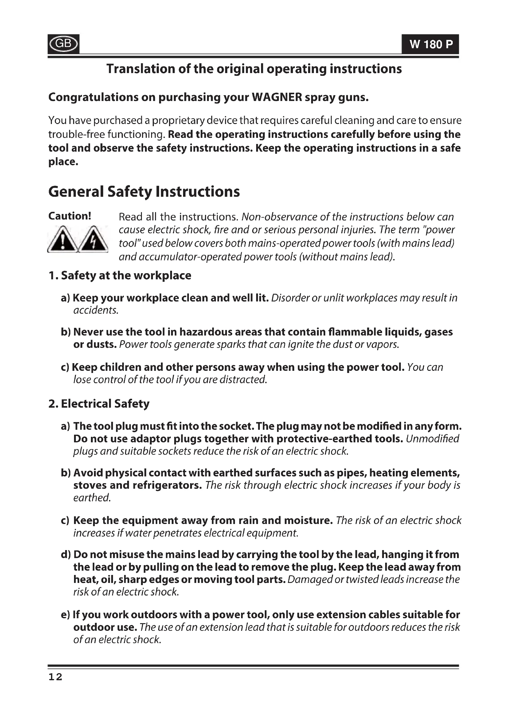 Translation of the original operating instructions Congratulations on purchasing your WAGNER spray guns. You have purchased a proprietary device that requires careful cleaning and care to ensure trouble-free functioning. Read the operating instructions carefully before using the tool and observe the safety instructions. Keep the operating instructions in a safe place. General Safety Instructions Caution! Read all the instructions. Non-observance of the instructions below can cause electric shock, re and or serious personal injuries. The term "power tool" used below covers both mains-operated power tools (with mains lead) and accumulator-operated power tools (without mains lead).