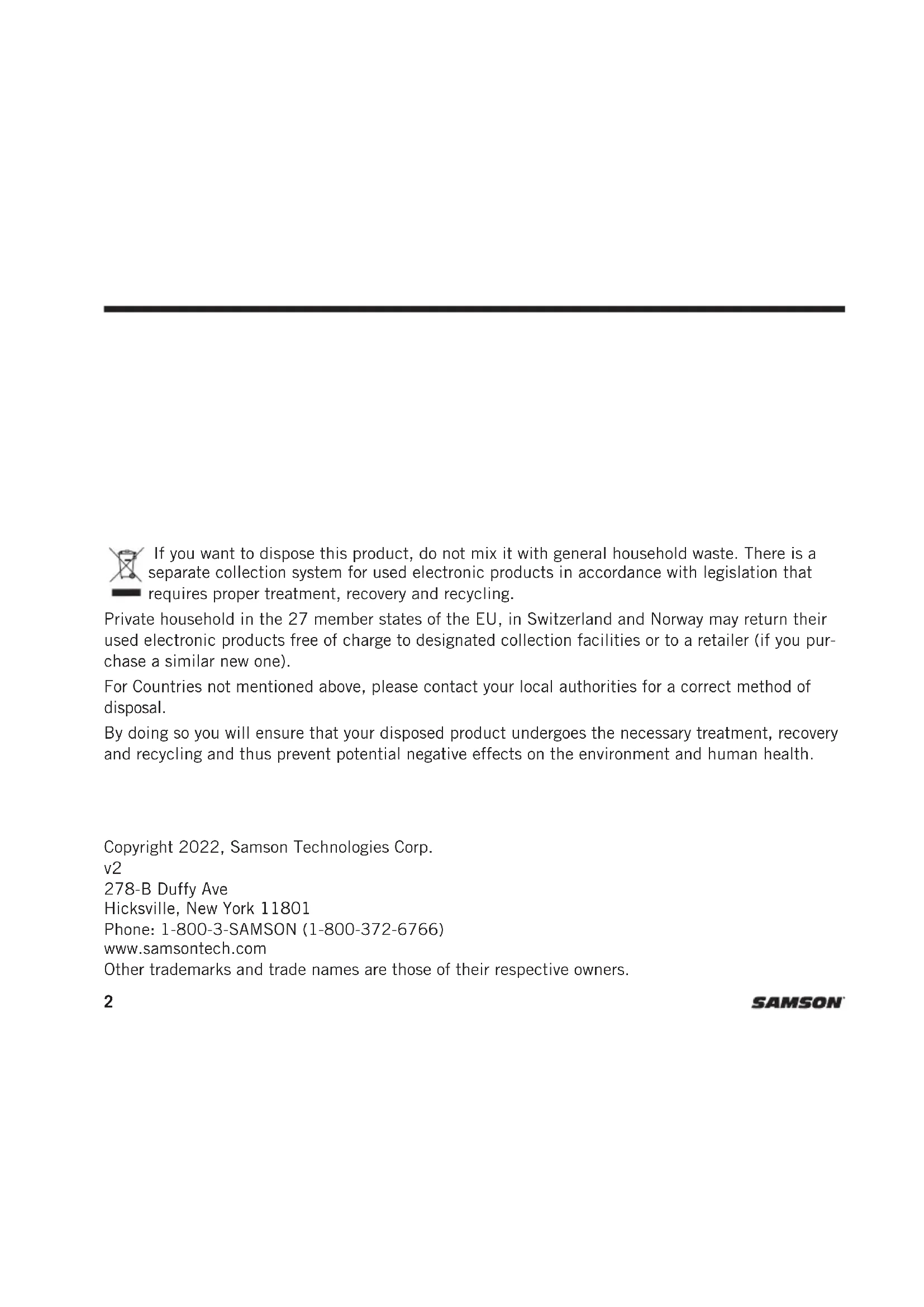 278-B Duffy Ave Hicksville, New York 11801 Phone: 1-800-3-SAMSON (1-800-372-6766) www.samsontech.com Other trademarks and trade names are those of their respective owners. If you want to dispose this product, do not mix it with general household waste. There is a separate collection system for used electronic products in accordance with legislation that requires proper treatment, recovery and recycling. Private household in the 27 member states of the EU, in Switzerland and Norway may return their used electronic products free of charge to designated collection facilities or to a retailer (if you pur- chase a similar new one). For Countries not mentioned above, please contact your local authorities for a correct method of disposal. By doing so you will ensure that your disposed product undergoes the necessary treatment, recovery and recycling and thus prevent potential negative effects on the environment and human health.3DE10x/DE50x/DE60x Headset Microphones ENFRDEESIT Congratulations on your purchase of the Samson DEx Headset Microphone. The DE10x and DE50x both feature an omnidirectional pickup pattern that delivers linear off-axis frequency response, resulting in a clear and articulate sound perfect for broadcast, worship, presentation, theater and fitness applications. The DE60x has a unidirectional pickup pattern, which provides superb isolation, resulting in more gain before feedback with clear and articulate sound in live sound applications. The DEx headset microphones includes four detachable adapter cables: 1/8” [3.5mm], Hirose® 4-Pin, Switchcraft® TA3F, Switchcraft® TA4F for compatibility with Samson wireless as well as most popular wireless transmitters. The pack includes four windscreens, a collar clip and protective carry case. The DEx microphones have gold-plated connectors, moisture-resistant coating and stainless steel mesh grille. They are dust and water/sweat-resistant rated at IP65. In addition, there is a moisture guard drip-ring to further protect the capsule and ensure reliable performance. If you have any questions or comments regarding the DEx Headset Microphone or any other products from Samson, do no hesitate to contact us at support@samsontech.com. Introduction4 The headset can be re-sized by sliding the ear hooks to fit snug around your head. If the headset is loose and will not stay in place, slide the ear hook wires back for a tighter fit. Adjust the microphone position by holding the left ear hook wire and slide the boom forward or back. For optimum performance the microphone should be close to the skin and towards the corner of the mouth, approximately a half inch away. Position the moisture guard ring as close to the capsule as possible. For outdoor use and to help reduce p-popping, install one of the included windscreens. Fitting the DE10x/50x/60x Microphone5DE10x/DE50x/DE60x Headset Microphones ENFRDEESIT Connector Cables The DE10x/DE50x/DE60x include four cables with adapters for some of the most popular wireless microphone body pack transmitters. 3.5mm Connector Works with Sennheiser