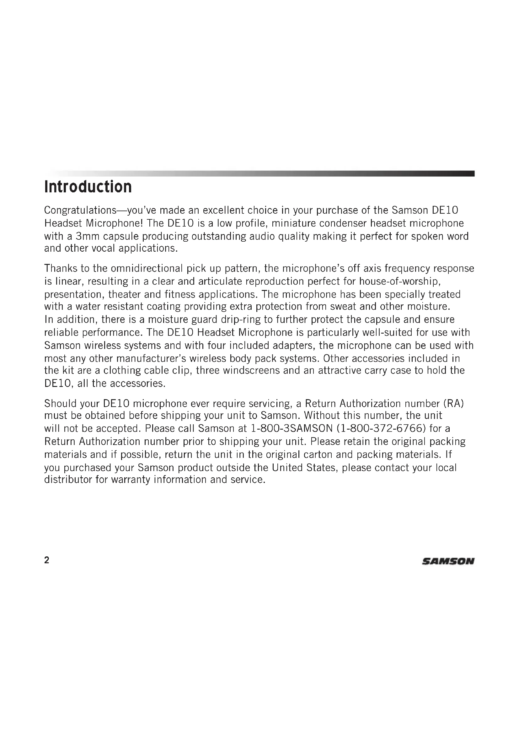 DE10 Headset Microphone2 Congratulations—you’ve made an excellent choice in your purchase of the Samson DE10 Headset Microphone! The DE10 is a low profile, miniature condenser headset microphone with a 3mm capsule producing outstanding audio quality making it perfect for spoken word and other vocal applications. Thanks to the omnidirectional pick up pattern, the microphone’s off axis frequency response is linear, resulting in a clear and articulate reproduction perfect for house-of-worship, presentation, theater and fitness applications. The microphone has been specially treated with a water resistant coating providing extra protection from sweat and other moisture. In addition, there is a moisture guard drip-ring to further protect the capsule and ensure reliable performance. The DE10 Headset Microphone is particularly well-suited for use with Samson wireless systems and with four included adapters, the microphone can be used with most any other manufacturer’s wireless body pack systems. Other accessories included in the kit are a clothing cable clip, three windscreens and an attractive carry case to hold the DE10, all the accessories. Should your DE10 microphone ever require servicing, a Return Authorization number (RA) must be obtained before shipping your unit to Samson. Without this number, the unit will not be accepted. Please call Samson at 1-800-3SAMSON (1-800-372-6766) for a Return Authorization number prior to shipping your unit. Please retain the original packing materials and if possible, return the unit in the original carton and packing materials. If you purchased your Samson product outside the United States, please contact your local distributor for warranty information and service. Introduction3DE10 Headset Microphone EN FR DE ES IT Features The DE10 Headset Microphone provides excellent vocal reproduction in a nearly invisible, low profile design. Here are some of it’s main features: