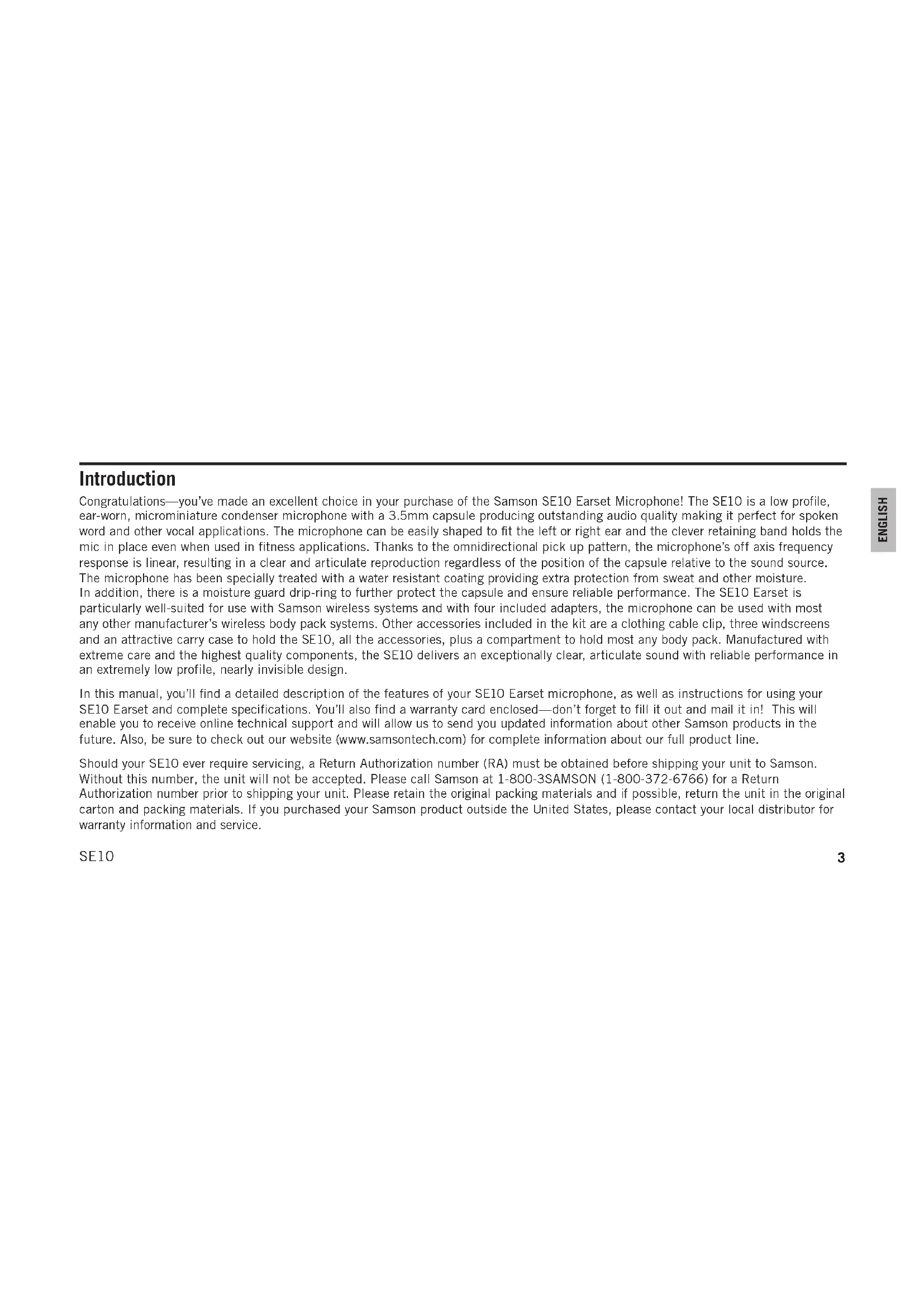 Introduction Congratulations—you’ve made an excellent choice in your purchase of the Samson SE10 Earset Microphone! The SE10 is a low profile, ear-worn, microminiature condenser microphone with a 3.5mm capsule producing outstanding audio quality making it perfect for spoken word and other vocal applications. The microphone can be easily shaped to fit the left or right ear and the clever retaining band holds the mic in place even when used in fitness applications. Thanks to the omnidirectional pick up pattern, the microphone’s off axis frequency response is linear, resulting in a clear and articulate reproduction regardless of the position of the capsule relative to the sound source. The microphone has been specially treated with a water resistant coating providing extra protection from sweat and other moisture. In addition, there is a moisture guard drip-ring to further protect the capsule and ensure reliable performance. The SE10 Earset is particularly well-suited for use with Samson wireless systems and with four included adapters, the microphone can be used with most any other manufacturer’s wireless body pack systems. Other accessories included in the kit are a clothing cable clip, three windscreens and an attractive carry case to hold the SE10, all the accessories, plus a compartment to hold most any body pack. Manufactured with extreme care and the highest quality components, the SE10 delivers an exceptionally clear, articulate sound with reliable performance in an extremely low profile, nearly invisible design. In this manual, you’ll find a detailed description of the features of your SE10 Earset microphone, as well as instructions for using your SE10 Earset and complete specifications. You’ll also find a warranty card enclosed—don’t forget to fill it out and mail it in! This will enable you to receive online technical support and will allow us to send you updated information about other Samson products in the future. Also, be sure to check out our website (www.samsontech.com) for complete information about our full product line. Should your SE10 ever require servicing, a Return Authorization number (RA) must be obtained before shipping your unit to Samson. Without this number, the unit will not be accepted. Please call Samson at 1-800-3SAMSON (1-800-372-6766) for a Return Authorization number prior to shipping your unit. Please retain the original packing materials and if possible, return the unit in the original carton and packing materials. If you purchased your Samson product outside the United States, please contact your local distributor for warranty information and service.4 SE10 Features The SE10 Omnidirectional Ear worn microphone provides excellent vocal reproduction in a nearly invisible, low profile single ear design. Following below are the SE10 main features: