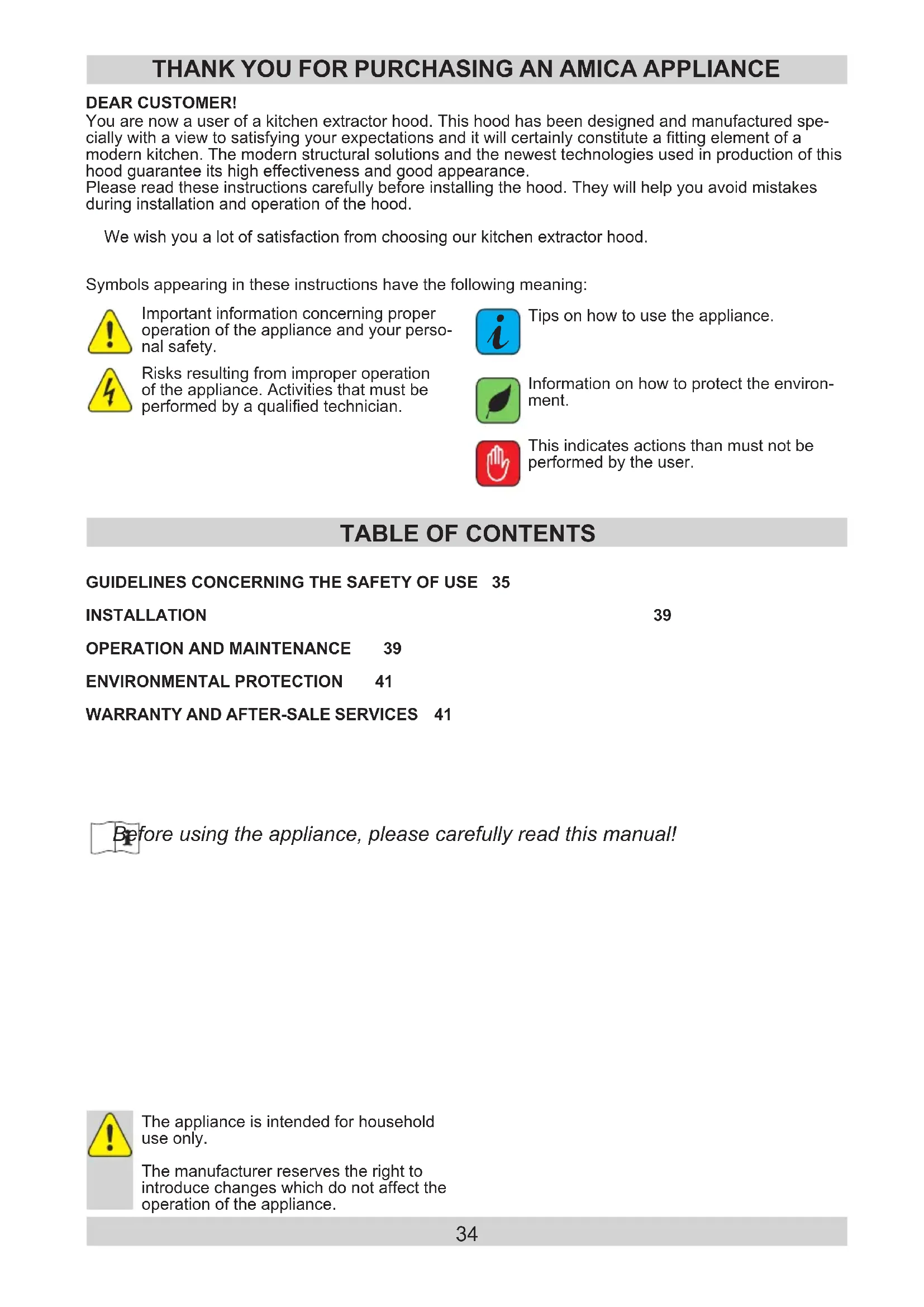 You are now a user of a kitchen extractor hood. This hood has been designed and manufactured spe- cially with a view to satisfying your expectations and it will certainly constitute a tting element of a modern kitchen. The modern structural solutions and the newest technologies used in production of this hood guarantee its high effectiveness and good appearance. Please read these instructions carefully before installing the hood. They will help you avoid mistakes during installation and operation of the hood. We wish you a lot of satisfaction from choosing our kitchen extractor hood. DEAR CUSTOMER! THANK YOU FOR PURCHASING AN AMICA APPLIANCE Symbols appearing in these instructions have the following meaning: This indicates actions than must not be performed by the user. Risks resulting from improper operation of the appliance. Activities that must be performed by a qualied technician. Important information concerning proper operation of the appliance and your perso- nal safety. Tips on how to use the appliance.