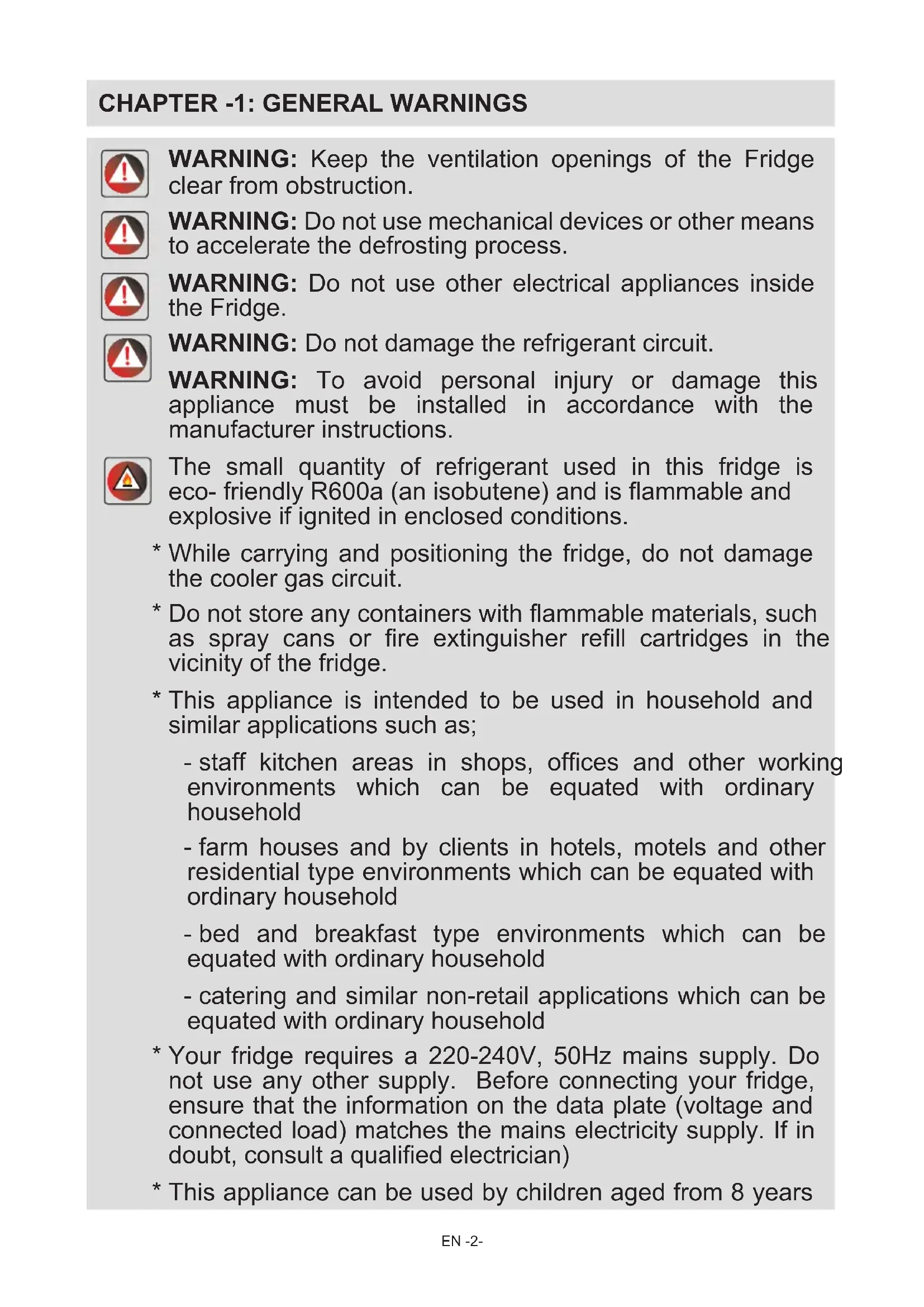 Your fridge freezer conforms to current safety requirements. Inappropriate use can lead to personal injury and damage to property. To avoid the risk of damage read this manual carefully before using your fridge freezer for the rst time. It contains important safety information on the installation, safety, use and maintenance of your Fridge Freezer. Retain this manual for future use.EN -2-