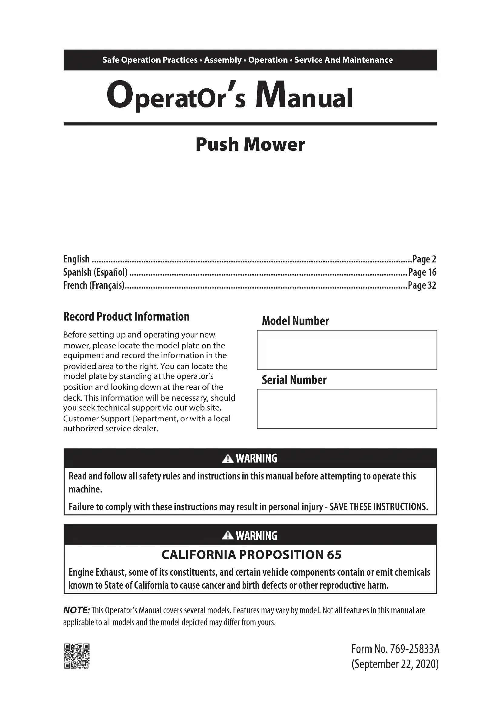 NOTE: This Operator’s Manual covers several models. Features may vary by model. Not all features in this manual are applicable to all models and the model depicted may differ from yours. OperatOr’s Manual Safe Operation Practices • Assembly • Operation • Service And Maintenance Form No. 769-25833A (September 22, 2020) Push Mower WARNING Read and follow all safety rules and instructions in this manual before attempting to operate this machine. Failure to comply with these instructions may result in personal injury - SAVE THESE INSTRUCTIONS. WARNING CALIFORNIA PROPOSITION 65 Engine Exhaust, some of its constituents, and certain vehicle components contain or emit chemicals known to State of California to cause cancer and birth defects or other reproductive harm. Record Product Information Before setting up and operating your new mower, please locate the model plate on the equipment and record the information in the provided area to the right. You can locate the model plate by standing at the operator’s position and looking down at the rear of the deck. This information will be necessary, should you seek technical support via our web site, Customer Support Department, or with a local authorized service dealer. Model Number Serial Number English ........................................................................................................................................Page 2 Spanish (Español) ......................................................................................................................Page 16 French (Français) ........................................................................................................................Page 322