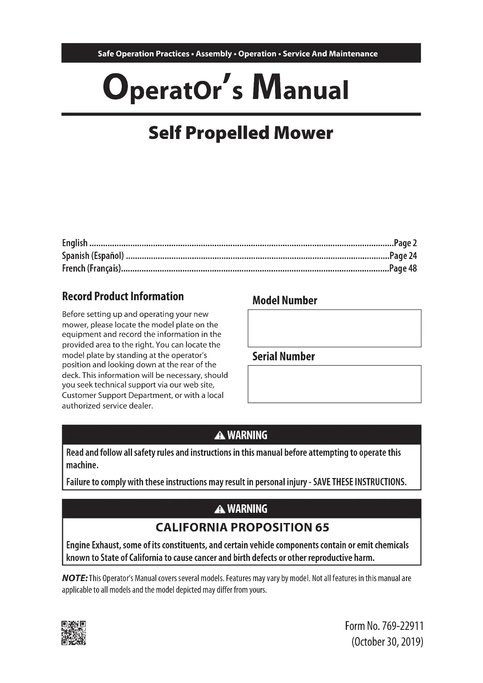 Safe Operation Practices • Assembly • Operation • Service And Maintenance OperatOr’s Manual Form No. 769-22911 (October 30, 2019) Self Propelled Mower NOTE: This Operator’s Manual covers several models. Features may vary by model. Not all features in this manual are applicable to all models and the model depicted may differ from yours. WARNING Read and follow all safety rules and instructions in this manual before attempting to operate this machine. Failure to comply with these instructions may result in personal injury - SAVE THESE INSTRUCTIONS. WARNING CALIFORNIA PROPOSITION 65 Engine Exhaust, some of its constituents, and certain vehicle components contain or emit chemicals known to State of California to cause cancer and birth defects or other reproductive harm. Record Product Information Before setting up and operating your new mower, please locate the model plate on the equipment and record the information in the provided area to the right. You can locate the model plate by standing at the operator’s position and looking down at the rear of the deck. This information will be necessary, should you seek technical support via our web site, Customer Support Department, or with a local authorized service dealer. Model Number Serial Number English ......................................................................................................................................Page 2 Spanish (Español) ....................................................................................................................Page 24 French (Français) ......................................................................................................................Page 482