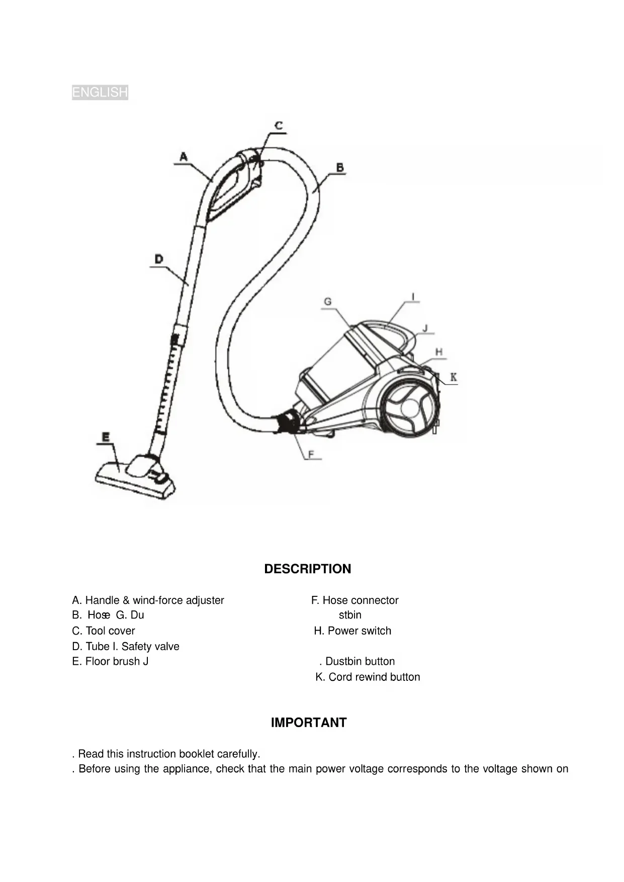 ube I. Safety valve E. Floor brush J . D ustbin button K. Cord rewind button IMPORTANT . R ead this instruction booklet carefully. . Before using the appliance, check that the main power voltage corresponds to the voltage shown onthe rating label. . The appliance should be connected to a correctly-earthed 10 power socket. . Always remove the plug from the power socket when the appliance is not in use and before carrying out any cleaning or maintenance operations. . Always remove the plug from the power socket before opening the appliance. . Never use methylated spirits or other solvents to clean the appliance. . Do not use the appliance to vacuum liquids. . Never leave the appliance unattended when it is switched on. . This appliance is for domestic use only. Use as described in this instruction booklet. . Do not switch the appliance on if it appears to be faulty in any way. . For repairing or accessories. Contact your dealer or an authorized Service Center. . If the supply cord is damaged, it must be replaced by the manufacturer or its service agent or a similarly qualified person in order to avoid a hazard. . This appliance is not intended for use by persons (including children) with reduced physical, sensory or mental capabilities, or lack of experience and knowledge, unless they have been given supervision or instruction concerning use of appliance by a person responsible for their safety. . Children should be supervised to ensure that they do not play with the appliance.
