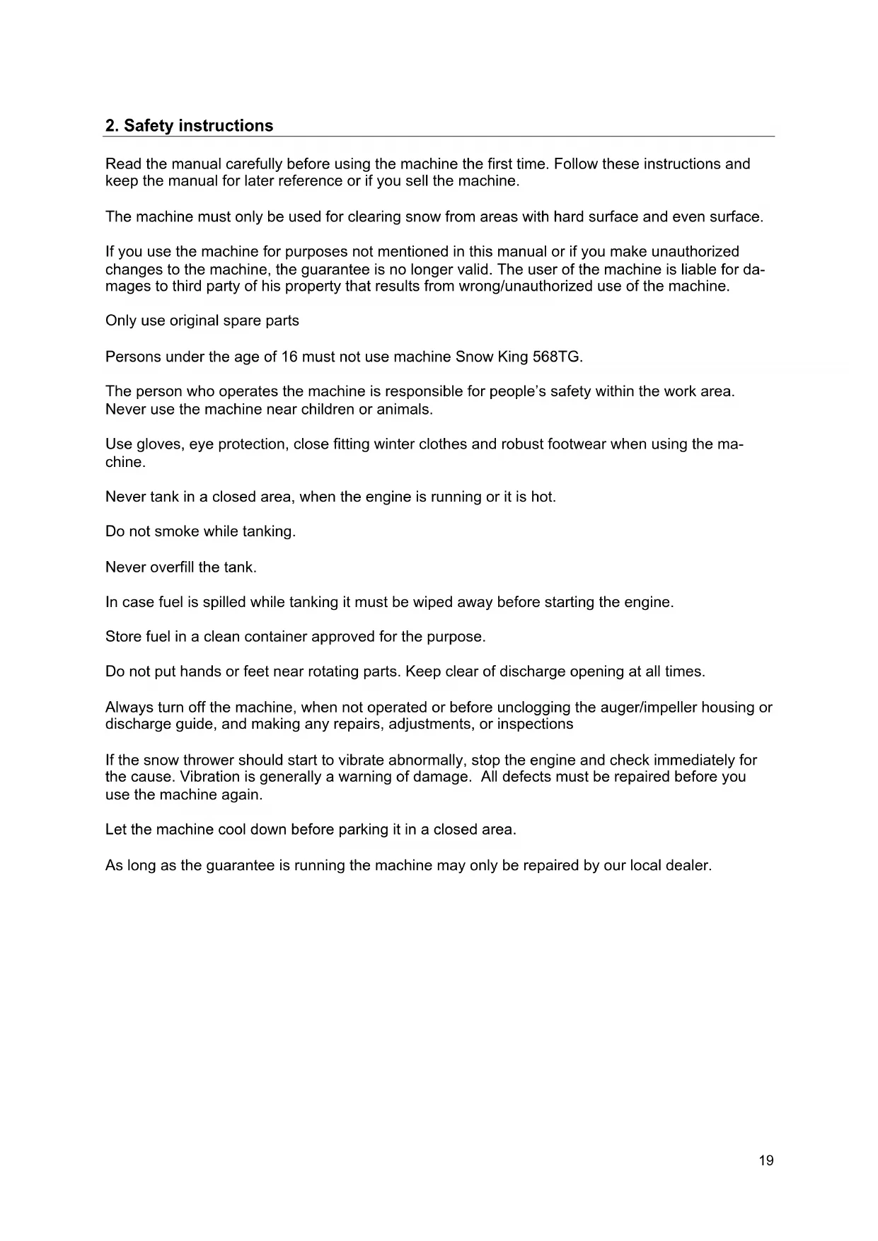 Read the manual carefully before using the machine the first time. Follow these instructions and keep the manual for later reference or if you sell the machine. The machine must only be used for clearing snow from areas with hard surface and even surface. If you use the machine for purposes not mentioned in this manual or if you make unauthorized changes to the machine, the guarantee is no longer valid. The user of the machine is liable for da- mages to third party of his property that results from wrong/unauthorized use of the machine. Only use original spare parts Persons under the age of 16 must not use machine Snow King 568TG. The person who operates the machine is responsible for people’s safety within the work area. Never use the machine near children or animals. Use gloves, eye protection, close fitting winter clothes and robust footwear when using the ma- chine. Never tank in a closed area, when the engine is running or it is hot. Do not smoke while tanking. Never overfill the tank. In case fuel is spilled while tanking it must be wiped away before starting the engine. Store fuel in a clean container approved for the purpose. Do not put hands or feet near rotating parts. Keep clear of discharge opening at all times. Always turn off the machine, when not operated or before unclogging the auger/impeller housing or discharge guide, and making any repairs, adjustments, or inspections If the snow thrower should start to vibrate abnormally, stop the engine and check immediately for the cause. Vibration is generally a warning of damage. All defects must be repaired before you use the machine again. Let the machine cool down before parking it in a closed area. As long as the guarantee is running the machine may only be repaired by our local dealer.20 The table below shows and describes safety symbols and pictograms that may appear on the product. You should pay particular attention to safety precautions, which are marked with this sym- bol