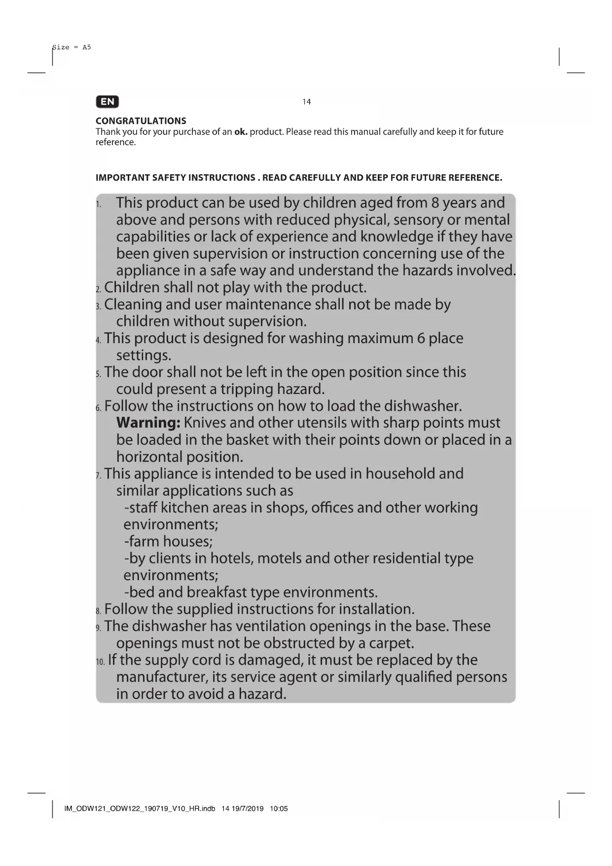 INTENDED USE This product is only intended for cleaning dishes and cutlery which are dishwasher proof or suitable for dishwashers. Any other use may result in damage to product or injuries. This product is designed for household use only and not intended for commercial use. IM_ODW121_ODW122_190719_V10_HR.indb 15 19/7/2019 10:0516 Size = A5