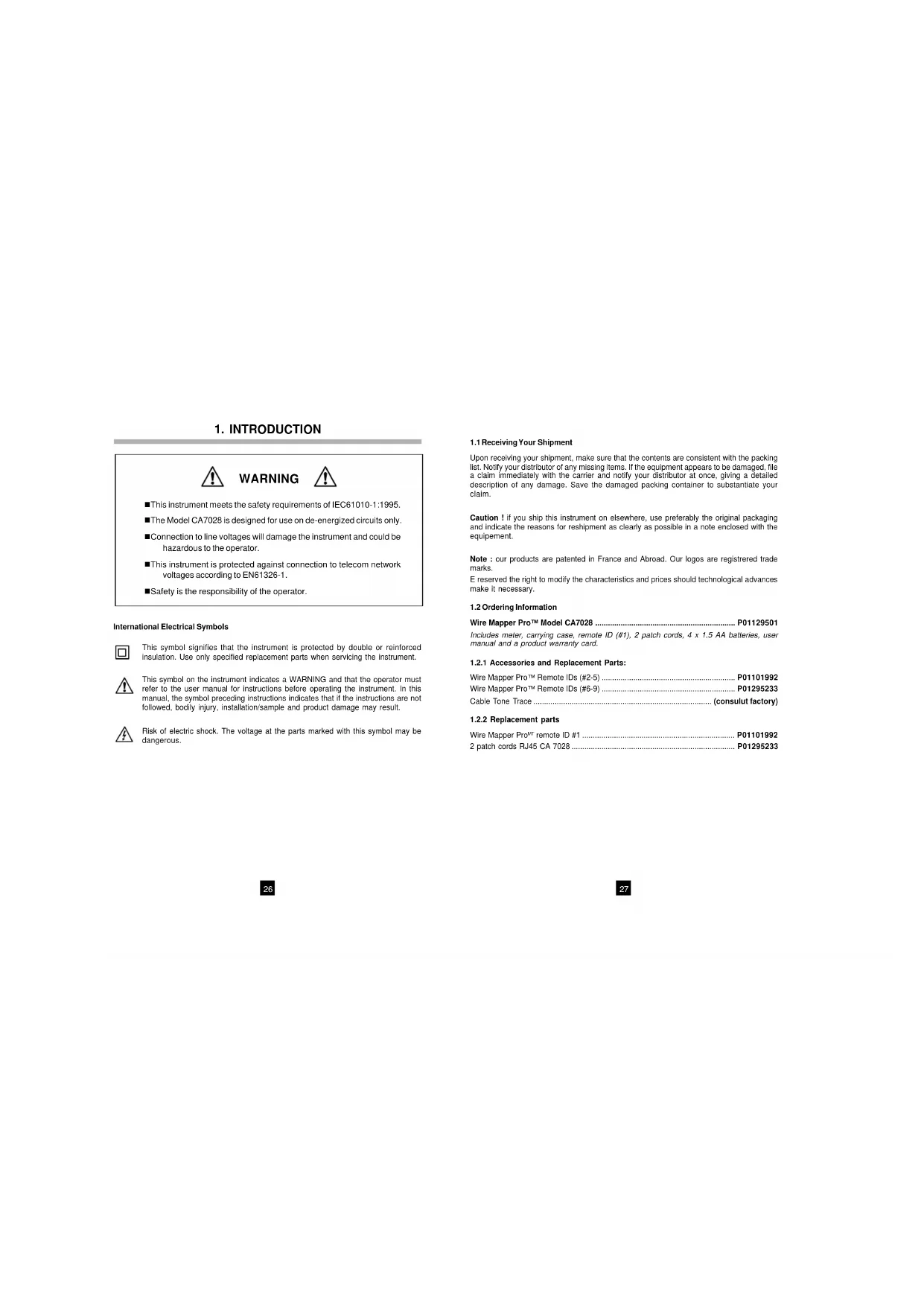 International Electrical Symbols This symbol signifies that the instrument is protected by double or reinforced insulation. Use only specified replacement parts when servicing the instrument. This symbol on the instrument indicates a WARNING and that the operator must refer to the user manual for instructions before operating the instrument. In this manual, the symbol preceding instructions indicates that if the instructions are not followed, bodily injury, installation/sample and product damage may result. Risk of electric shock. The voltage at the parts marked with this symbol may be dangerous. WARNING n This instrument meets the safety requirements of IEC61010-1:1995. n The Model CA7028 is designed for use on de-energized circuits only. n Connection to line voltages will damage the instrument and could be hazardous to the operator. n This instrument is protected against connection to telecom network voltages according to EN61326-1. n Safety is the responsibility of the operator.2928
