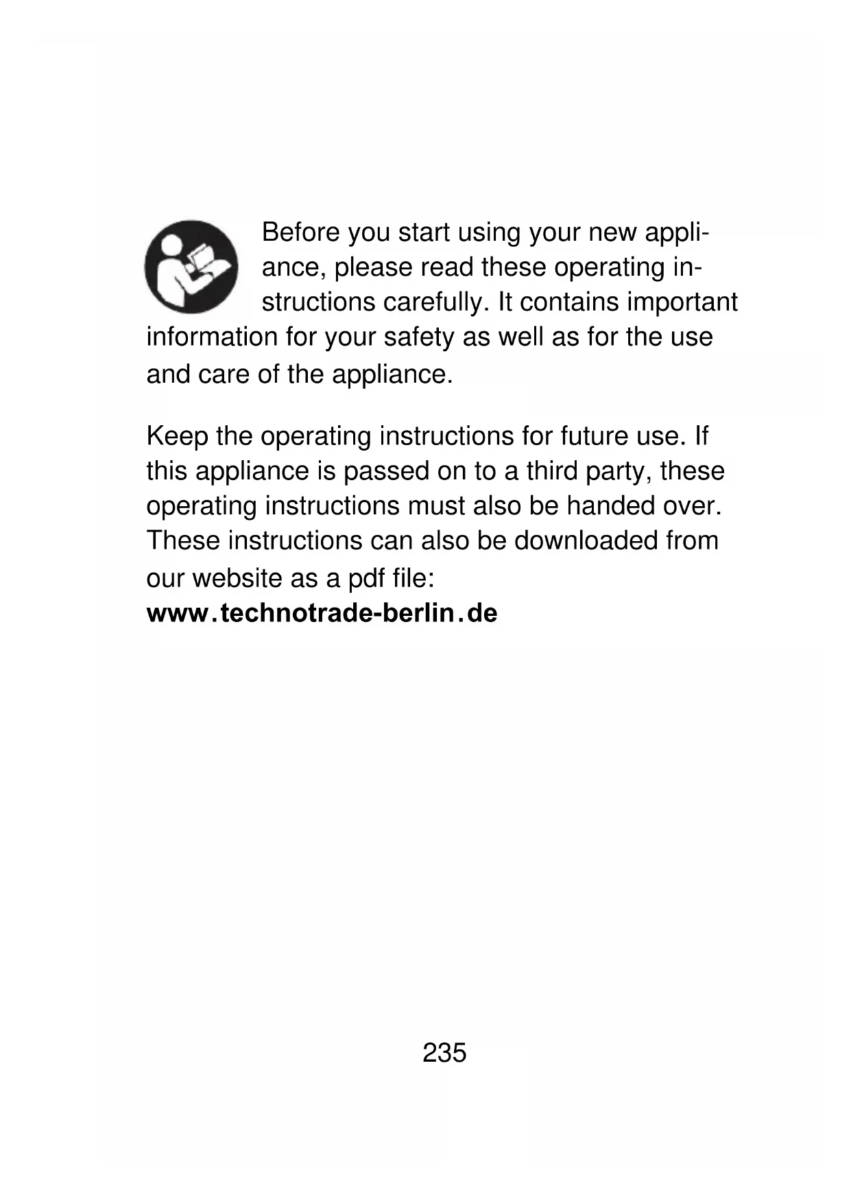 - Warranty card 35 Before you start using your new appli- ance, please read these operating in- structions carefully. It contains important information for your safety as well as for the use and care of the appliance. Keep the operating instructions for future use. If this appliance is passed on to a third party, these operating instructions must also be handed over. These instructions can also be downloaded from our website as a pdf file: www . technotrade-berlin . de236 Introduction You have purchased a weather station with the innovative DirektWetter technology. Weather spe- cialist developed this world first, which helps your station to receive regional weather forecasts pro- duced professional meteorologists. In addition, the local outdoor temperature is transmitted to the base station via a radio tranmitter with 868 MHz and a range of up to 50 metres. This gives you a comprehensive picture of the current and future weather situation. Thanks to the latest technology, the weather sttion is easy to operate with just a few buttons.237 For your safety Intended use This weather station is used to display and carry out the functions mentioned in the operating in- structions. The unit consists of a receiver (base station) and a transmitter. The receiver and the transmitter are battery-operated and can therefore be set up independently of power sources. A smartphone with internet access is required to use the station with the free app. The base station may only be used in dry indoor areas and the outdoor transmitter only in protect- ed outdoor areas. This appliance can be used by children aged from 8 years and above and persons with reduced physical, sensory or mental capabilities or lack of238 experience and knowledge if they have been giv- en supervision or instruction concerning use of the appliance in a safe way and understand the hazards involved. Children must not play with the appliance. The appliance is intended for domestic use only and not for commercial use. This appliance must not be used for medical purposes or for providing information to the public. Use the device only for its intended purpose. It must not be modified or technically altered.239 Explanation of symbols and terms WARNING This signal icon/word indicates a hazard with a medium level of risk which, if not avoided, may result in death or serous injury. CAUTION This signal symbol/word indicates a low-risk haz- ard which, if not avoided, may result in minor or moderate injury.240 Safety instructions WARNING Danger of choking! Children can get caught in the packaging film and put small parts in their mouths. Do not let children play with the packaging. Keep children away from small parts. Keep batteries and small parts away from chil- dren. Seek medical attention immediately if a battery is swallowed. Dangers for certain groups of people This appliance can be used by children aged from 8 years and above and persons with reduced physical, sensory or mental capabilities or lack of experience and knowledge if they have been giv- en supervision or instruction concerning use of the appliance in a safe way and understand the hazards involved.241 Children must not play with the appliance. Cleaning and user maintenance must not be carried out by children without supervision. Danger of explosion!! Never expose batteries to extreme tempera- tures such as direct sunlight or fire. Do not place the unit on a radiator. Leaking battery ac- id can cause damage. Always insert batteries according to the correct polarity (+ and -). Only use batteries of the same type with the corresponding technical data. Do not use old and new batteries together or batteries of different types or manufacturers. Do not short-circuit batteries, throw them into fire or disassemble them. Non-rechargeable batteries are not to be re- charged.242 Danger of chemical burns! In the event of a fault or damage, electrolyte can leak from the battery. Avoid any contact with leaking electrolyte. In the event of contact with leaking electrolyte, rinse the area immediately with clean water. In case of eye contact, consult a doctor imme- diately. Risk of damage! Do not expose the unit to extreme force or im- pact. Do not expose the unit to high temperatures, direct sunlight, dust, moisture, dripping or splashing water. Do not immerse the unit in water or other liq- uids. Do not place objects filled with liquids, such as vases, on the unit. Avoid contact of the unit with corrosive materi- als.243 Do not open the casing or tamper with any structural parts of the unit. This appliance does not contain any user- serviceable parts. Any maintenance must be carried out by qualified personnel. Disclaimer The weather data is transmitted via your WLAN network with internet connection. The continued use of the weather station depends on the opera- tional readiness of the transmission media, over which the seller has no influence. Failures of the transmission media are not excluded. They do not represent a defect of the device. The seller also has no influence on the transmit- ted weather data and weather forecasts. The manufacturer and dealer accept no responsibility for incorrect readings and the consequences thereof. This device is intended for home use only and does not provide 100% accuracy. The forecasts244 of this device are to be understood as indicative values. Please note that our warranty is void in the event of misuse or improper handling, non-observance of the safety instructions applicable to the unit, the use of force or interventions not carried out by the service address authorized by us. The specifications of this unit are subject to change without notice. This manual may not be reproduced, in whole or in part, without the written consent of the manu- facturer. p. 3052