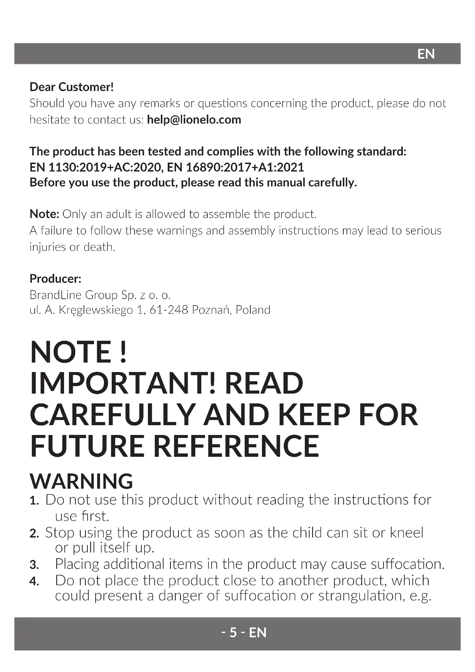 Should you have any remarks or questions concerning the product, please do not hesitate to contact us: help@lionelo.com