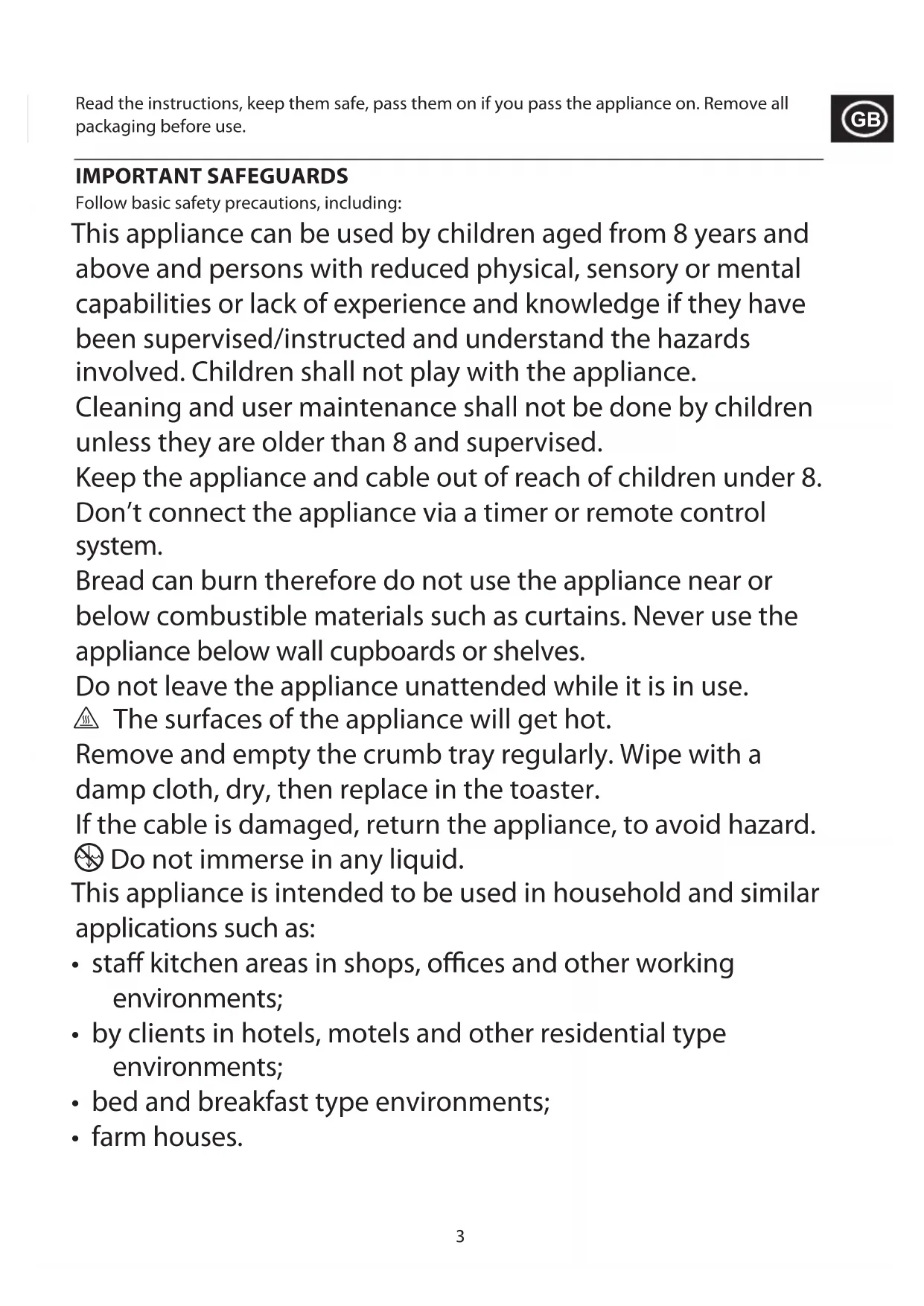 Read the instructions, keep them safe, pass them on if you pass the appliance on. Remove all packaging before use. IMPORTANT SAFEGUARDS Follow basic safety precautions, including: This appliance can be used by children aged from 8 years and above and persons with reduced physical, sensory or mental capabilities or lack of experience and knowledge if they have been supervised/instructed and understand the hazards involved. Children shall not play with the appliance. Cleaning and user maintenance shall not be done by children unless they are older than 8 and supervised. Keep the appliance and cable out of reach of children under 8. Don’t connect the appliance via a timer or remote control system. Bread can burn therefore do not use the appliance near or below combustible materials such as curtains. Never use the appliance below wall cupboards or shelves. Do not leave the appliance unattended while it is in use. ¬ The surfaces of the appliance will get hot. Remove and empty the crumb tray regularly. Wipe with a damp cloth, dry, then replace in the toaster. If the cable is damaged, return the appliance, to avoid hazard. i Do not immerse in any liquid. This appliance is intended to be used in household and similar applications such as: