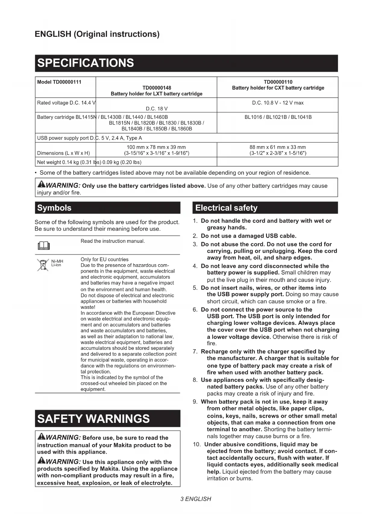 To install the battery cartridge, align the tongue on the battery cartridge with the groove in the housing and slip it into place. Insert the battery cartridge all the way until it locks in place with a small click. If you can see the red indicator on the upper side of the button, it is not locked completely. To remove the battery cartridge, slide it from the battery holder while pressing the button on the front of the cartridge. CAUTION: Always install the battery car- tridge fully until the red indicator cannot be seen. Otherwise the battery cartridge may accidentally fall out of the battery holder, causing injury to you or someone around you. CAUTION: Do not forcibly install the battery cartridge. If the battery cartridge does not slide in easily, it is not being inserted correctly.6 ENGLISH Attaching the battery holder You can hang the battery holder on your waist belt. To prevent the battery holder from dropping acciden- tally, attach a strap using the strap hole and secure it. ► Fig.3: 1. Strap hole The battery holder has an anti-drop function. When removing the battery holder from the belt, pull up the battery holder while pressing the unlock button. ► Fig.4: 1. Unlock button Connecting USB devices CAUTION: Connect only devices that are compatible with the USB power supply port. Not doing so may cause a malfunction of the battery holder. NOTICE: Before connecting a USB device to the battery holder (with the battery), always back up the data on the USB device. Not doing so may cause a loss of your data. NOTICE: The battery holder may not supply power to some USB devices. NOTICE: When not in use or after charging, remove the USB cable and close the cover. The battery holder (with the battery cartridge) can work as an external power supply for USB devices. Open the cover and connect a USB cable (not included) to the USB port of the battery holder. Then connect the other end of the cable to the device. To start charging, press and hold the power button until the power level indicator lights up. To stop charging, press and hold the power button until the power level indicator turns o. ► Fig.5: 1. Cover 2. USB port NOTE: The actual output current varies depending on the USB device to be connected. NOTE: Battery power is consumed while the power button is turned on. Always turn o the switch when not in use. NOTE: When charging multiple USB devices in suc- cession, wait about 10 seconds after charging of the previous device has completed before beginning to charge the next device. MAINTENANCE NOTICE: Never use gasoline, benzine, thinner, alcohol or the like. Discoloration, deformation or cracks may result. NOTICE: Do not wash the battery holder with water. — Wipe o dirt, dust, oil, grease, .etc on the housing with clean dry cloth or one dipped in soapy water and tightly wrung out. — Keep the appliance in a place where it will not be extremely hot, cold or humid. To maintain product SAFETY and RELIABILITY, repairs, any other maintenance or adjustment should be performed by Makita Authorized or Factory Service Centers, always using Makita replacement parts.7 PORTUGUÊS DO BRASIL PORTUGUÊS DO BRASIL (Instruções originais) ESPECIFICAÇÕES Modelo TD00000111 TD00000148 Porta-bateria para bateria LXT TD00000110 Porta-bateria para bateria CXT Tensão nominal C.C. 14,4 V C.C. 18 V C.C. 10.8 V - 12 V máx.: Bateria BL1415N / BL1430B / BL1440 / BL1460B BL1815N / BL1820B / BL1830 / BL1830B / BL1840B / BL1850B / BL1860B BL1016 / BL1021B / BL1041B Porta USB de alimentação C.C. 5 V, 2,4 A, tipo A Dimensões (C x L x A) 100 mm x 78 mm x 39 mm 88 mm x 61 mm x 33 mm Peso líquido 0,14 kg 0,09 kg