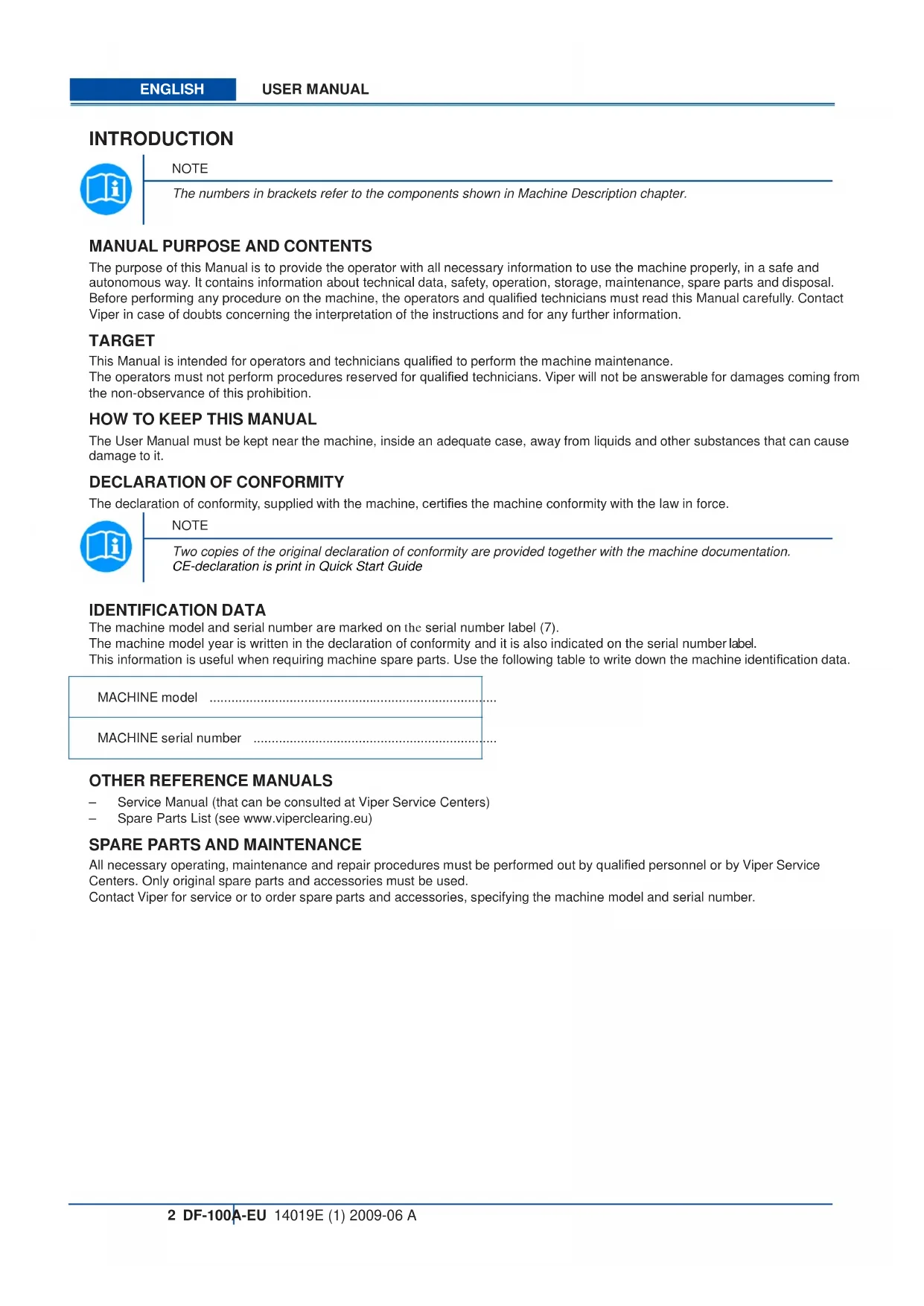 The purpose of this Manual is to provide the operator with all necessary information to use the machine properly, in a safe and autonomous way. It contains information about technical data, safety, operation, storage, maintenance, spare parts and disposal. Before performing any procedure on the machine, the operators and qualified technicians must read this Manual carefully. Contact Viper in case of doubts concerning the interpretation of the instructions and for any further information. TARGET This Manual is intended for operators and technicians qualified to perform the machine maintenance. The operators must not perform procedures reserved for qualified technicians. Viper will not be answerable for damages coming from the non-observance of this prohibition.