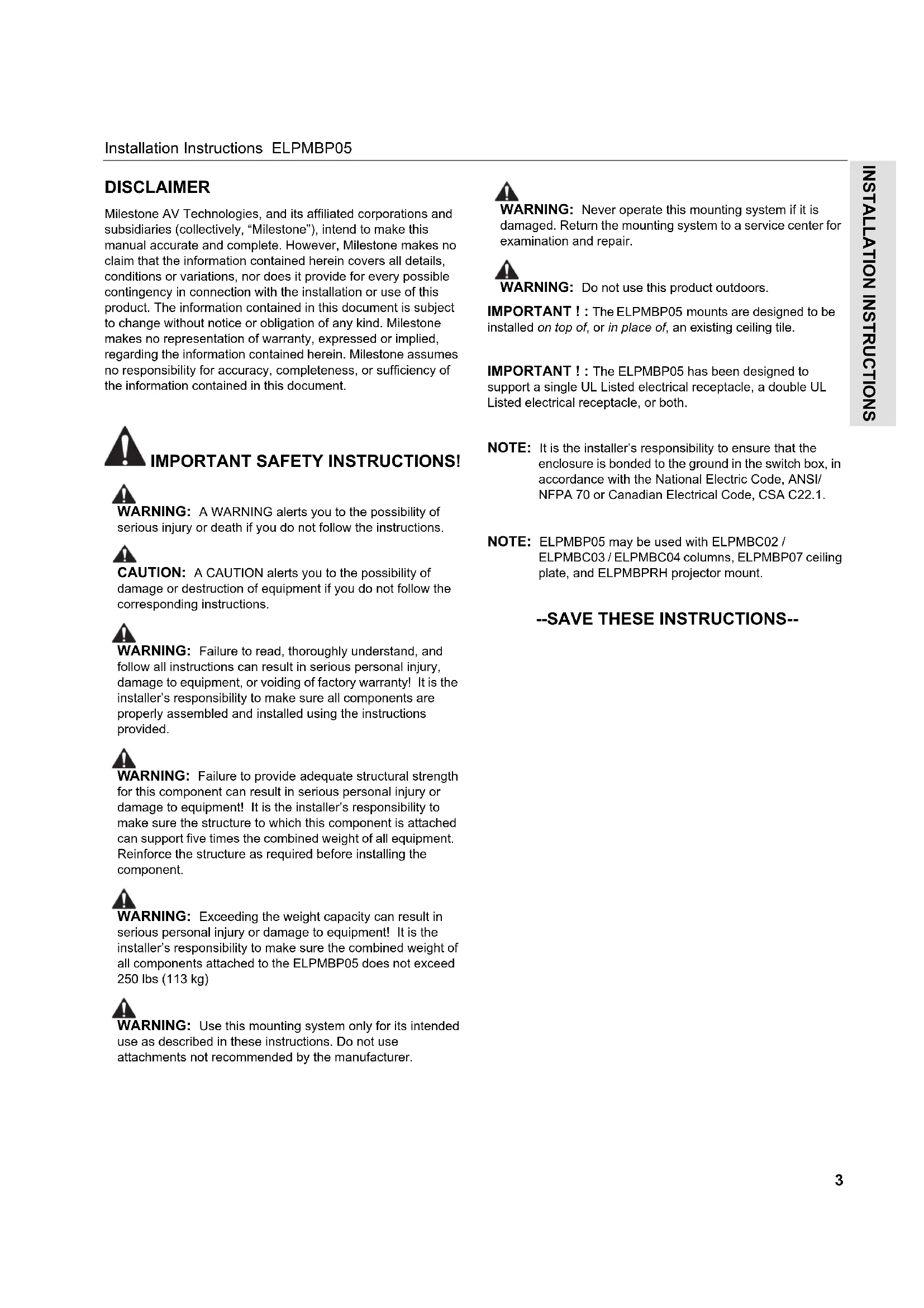 IMPORTANT ! : The ELPMBP05 mounts are designed to be installed on top of, or in place of, an existing ceiling tile. IMPORTANT ! : The ELPMBP05 has been designed to support a single UL Listed electrical receptacle, a double UL Listed electrical receptacle, or both. NOTE: It is the installer’s responsibility to ensure that the enclosure is bonded to the ground in the switch box, in accordance with the National Electric Code, ANSI/ NFPA 70 or Canadian Electrical Code, CSA C22.1. NOTE: ELPMBP05 may be used with ELPMBC02 / ELPMBC03 / ELPMBC04 columns, ELPMBP07 ceiling plate, and ELPMBPRH projector mount.