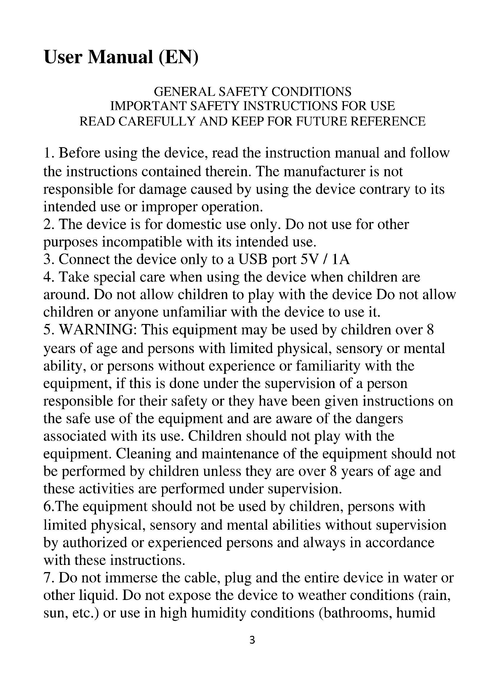 years of age and persons with limited physical, sensory or mental ability, or persons without experience or familiarity with the equipment, if this is done under the supervision of a person responsible for their safety or they have been given instructions on the safe use of the equipment and are aware of the dangers associated with its use. Children should not play with the equipment. Cleaning and maintenance of the equipment should not be performed by children unless they are over 8 years of age and these activities are performed under supervision. 6.The equipment should not be used by children, persons with limited physical, sensory and mental abilities without supervision by authorized or experienced persons and always in accordance with these instructions.