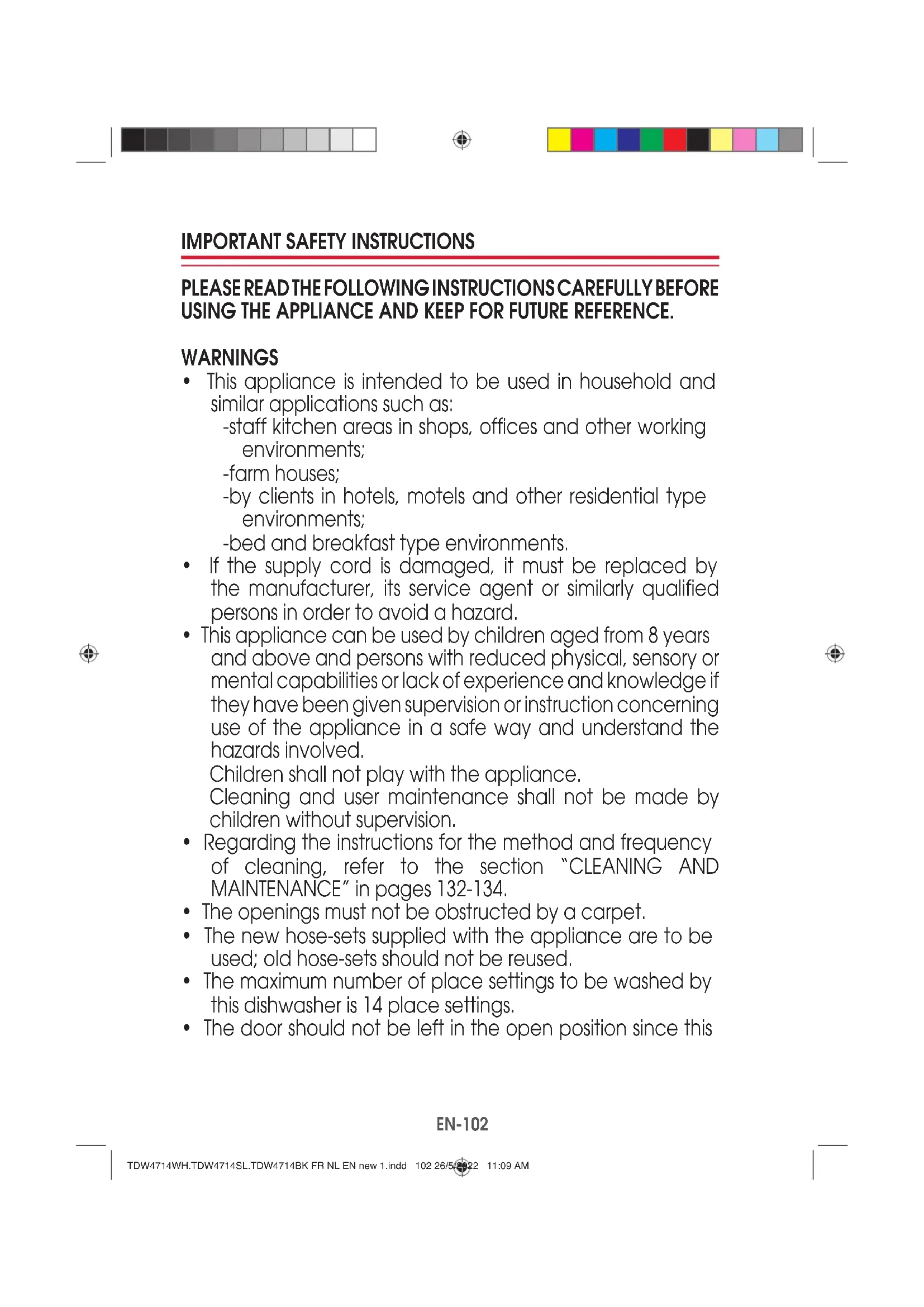 - Do not wash plastic items unless they are marked “dishwasher safe” or the equivalent. TDW4714WH.TDW4714SL.TDW4714BK FR NL EN new 1.indd 103 26/5/2022 11:09 AMEN-104