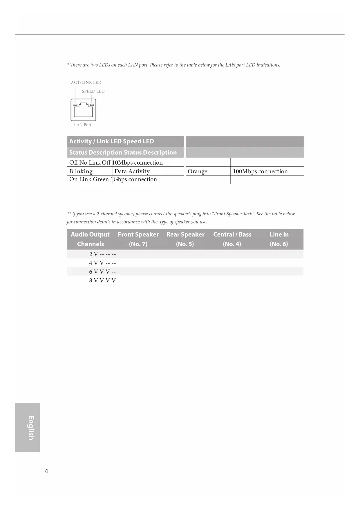 - ere are two LEDs on each LAN port. Please refer to the table below for the LAN port LED indications. Activity / Link LED Speed LED Status Description Status Description O No Link O 10Mbps connection Blinking Data Activity Orange 100Mbps connection On Link Green 1Gbps connection ** If you use a 2-channel speaker, please connect the speaker’s plug into “Front Speaker Jack”. See the table below for connection details in accordance with the type of speaker you use. Audio Output Channels Front Speaker (No. 7) Rear Speaker (No. 5) Central / Bass (No. 4) Line In (No. 6) 2 V -- -- -- 4 V V -- -- 6 V V V -- 8 V V V V ACT/LINK LEDSPEED LEDLAN Port