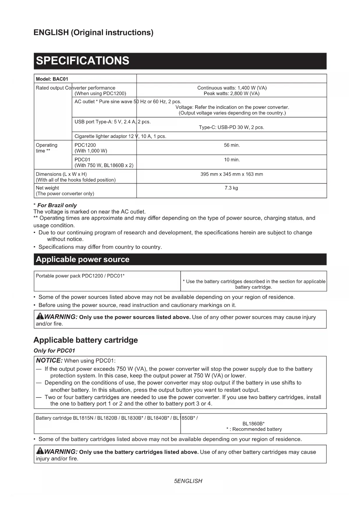 - Specications may dier from country to country. Applicable power source Portable power pack PDC1200 / PDC01*