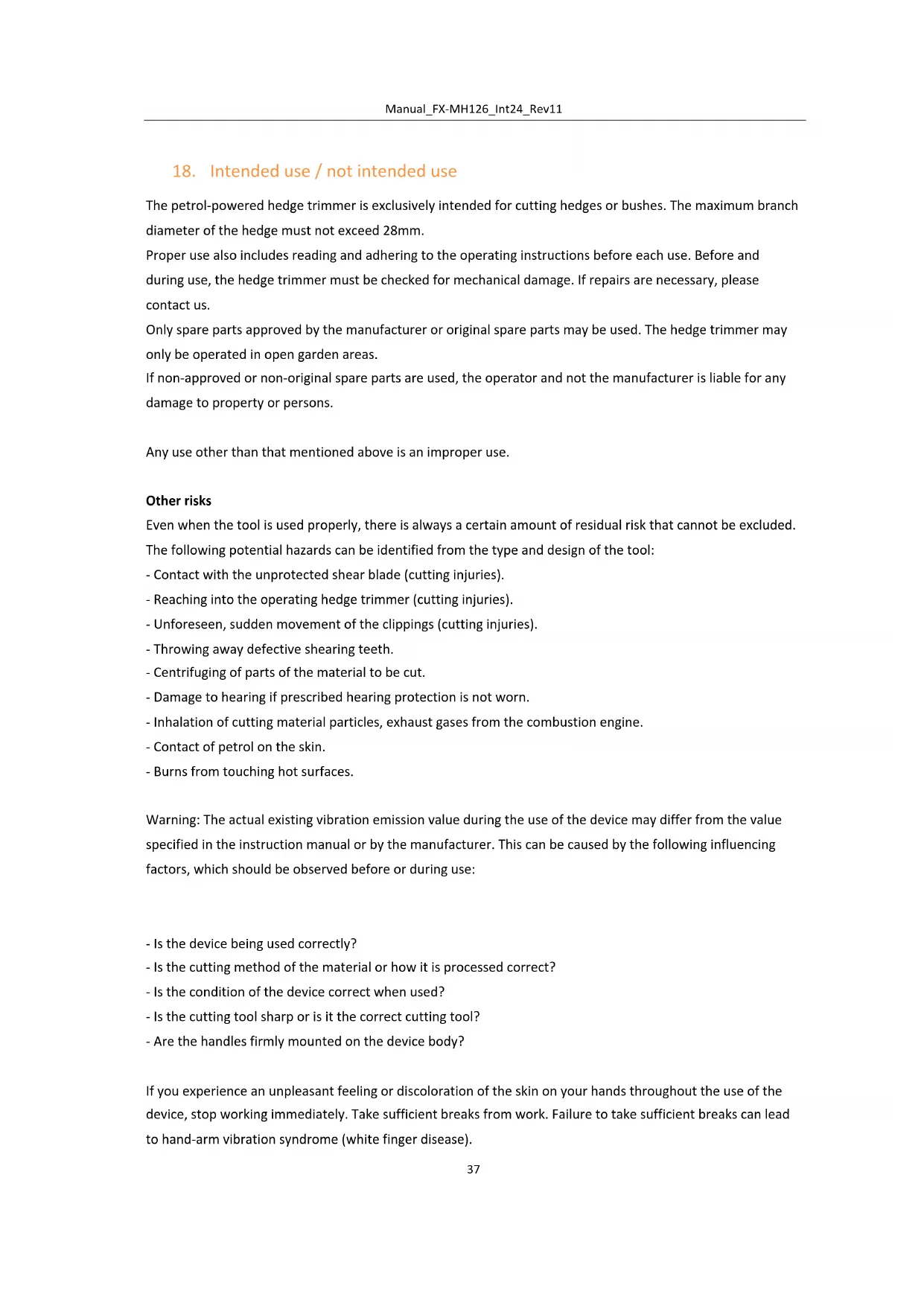 An estimation of the degree of strain depending on the work or use of the device should be made and appropriate breaks in work should be taken. In this way, the degree of stress can be significantly reduced throughout the working time. Minimize your risk of being exposed to vibrations. Maintain this device according to the instructions in the operating manual. Avoid using the device at temperatures of 10°C or less. Make a work plan that limits the vibration exposure. A certain amount of noise from this equipment cannot be avoided. Do noisy work at approved and designated times. If necessary, observe rest periods and limit the duration of work to the absolute minimum. For your personal protection and the protection of persons in the vicinity, wear suitable hearing protection. National regulations may restrict the use of this equipment.Manual_FX-MH126_Int24_Rev11