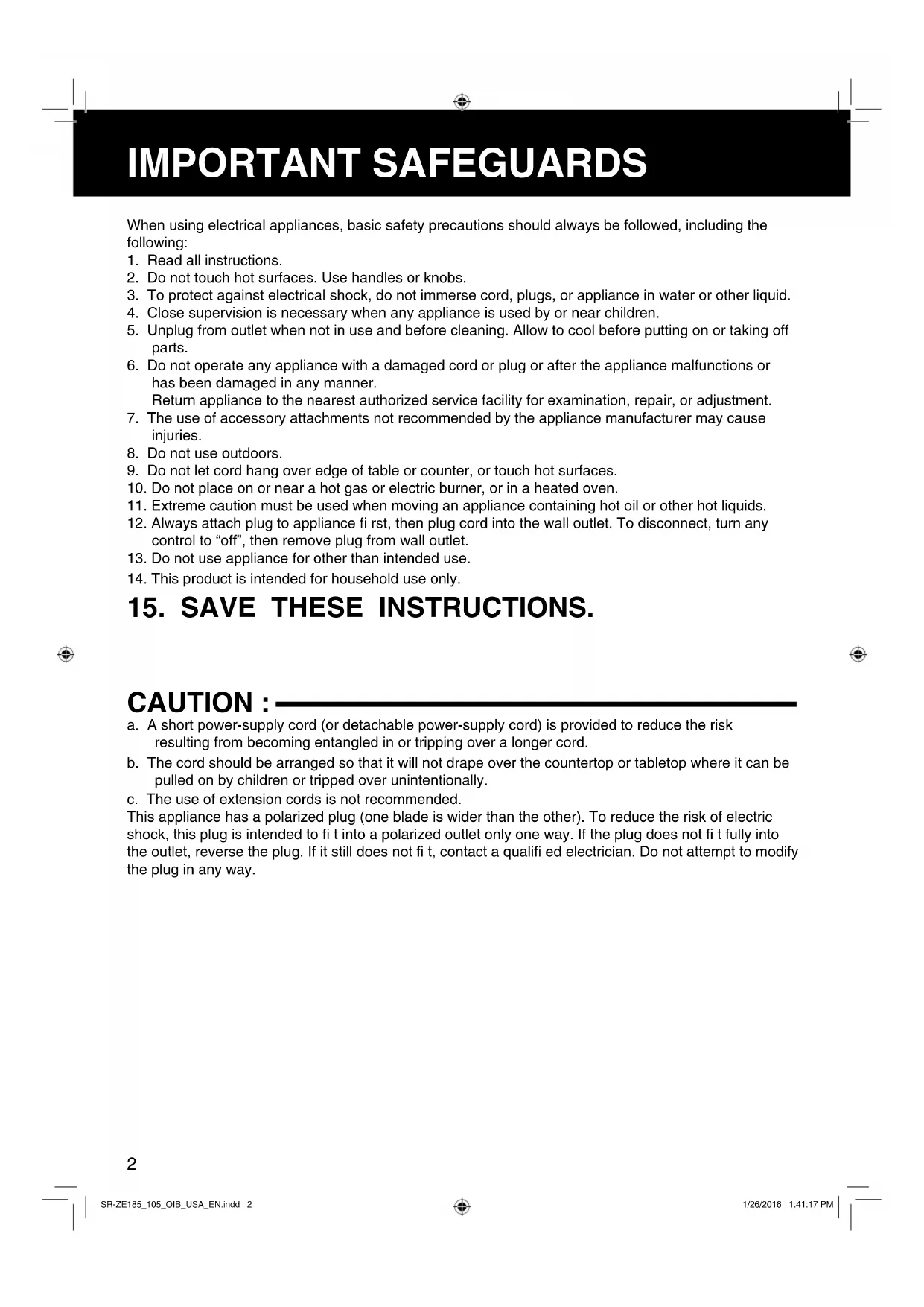 - When cooking is over, the electric rice cooker beeps and automatically switches to the Keep Warm function (The indicator turns off and the indicator lights up automatically). However, we do not recommend using the Keep Warm function as it may affect the taste. Press the button to exit the Keep Warmfunction and unplug the power plug. SR-ZE185_105_OIB_USA_EN.indd 11SR-ZE185_105_OIB_USA_EN.indd 11 1/26/2016 1:41:49 PM1/26/2016 1:41:49 PM12 Functions Soup / Slow Cook Important Information• The maximum amount of ingredients and liquid forSoup / Slow Cook cannot exceed the maximumwater line for “White Rice”. Preparations