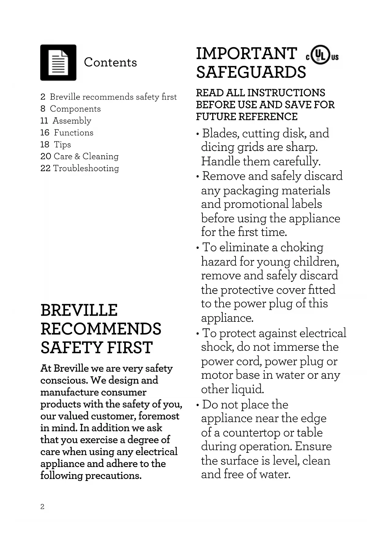 BFP8382 2 Breville recommends safety first 8 Components 11 Assembly 16 Functions 18 Tips 20 Care & Cleaning 22 Troubleshooting Contents BREVILLE RECOMMENDS SAFETY FIRST At Breville we are very safety conscious. We design and manufacture consumer products with the safety of you, our valued customer, foremost in mind. In addition we ask that you exercise a degree of care when using any electrical appliance and adhere to the following precautions. IMPORTANT SAFEGUARDS