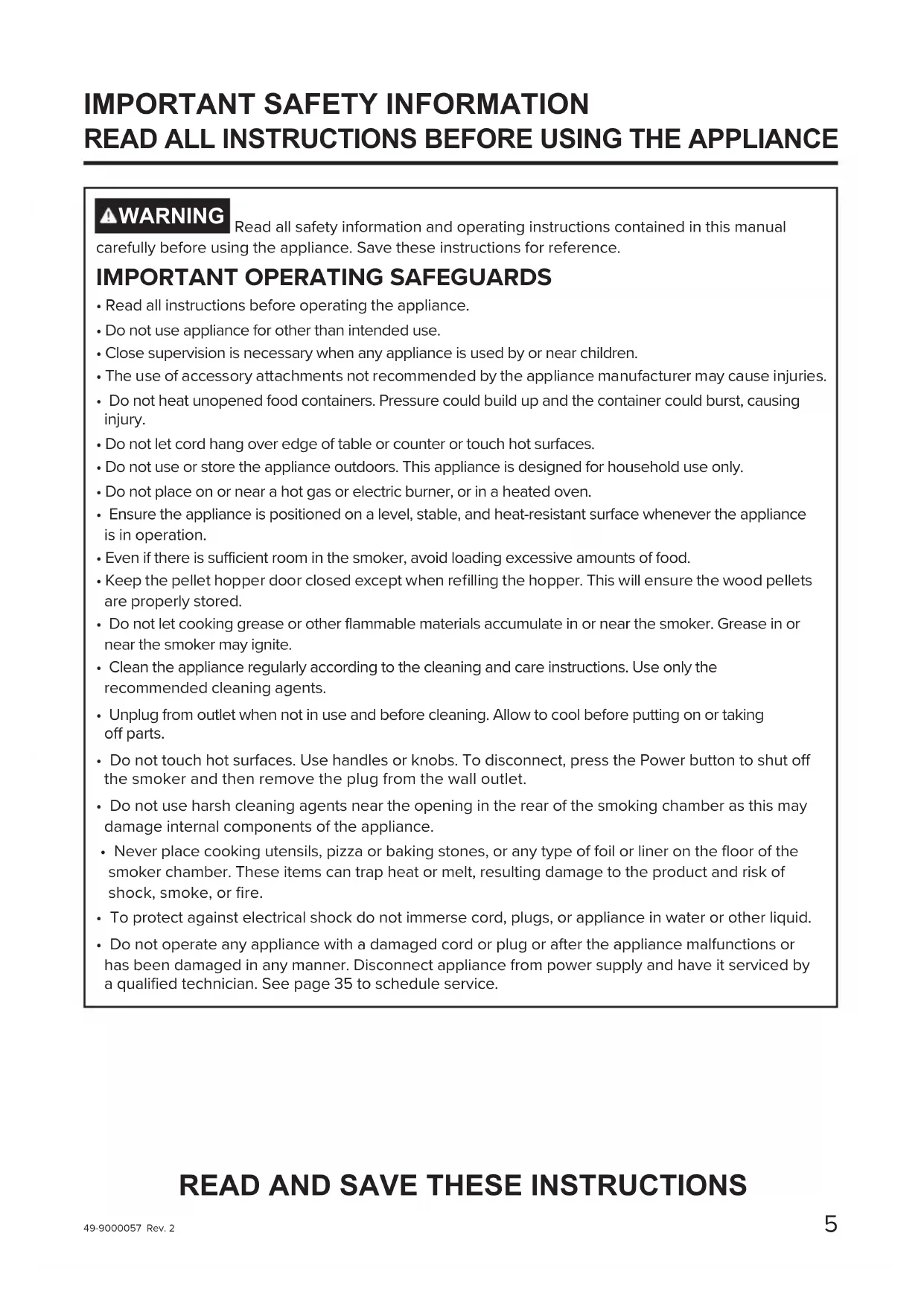 - Wire racks and temperature probes may be extremely hot when preheated. Use extreme caution when loading food onto racks and when inserting, removing, or adjusting temperature probes.• Do not use wood chips with the smoker. READ AND SAVE THESE INSTRUCTIONS49-9000057 Rev. 2