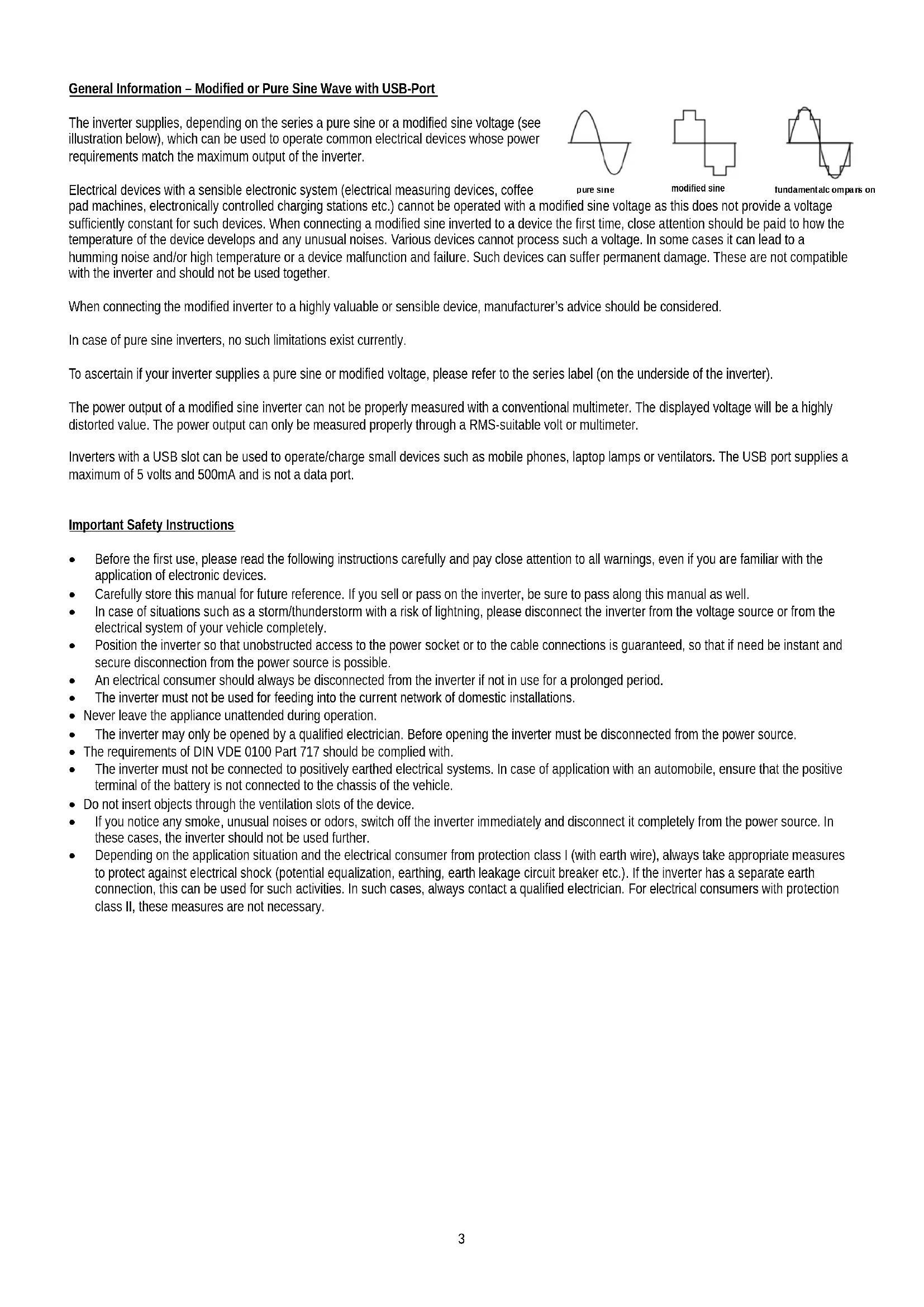 Accessories SL series - Pre-installed cable set with cigarette lighter plug CL, CLS series - 1 cable set each with cigarette lighter plug and crocodile clamps HPL, HPLS series - 1 or 2 cable sets depending on type for secure fastening to the battery and to the inverter through screwing. Attention: In case of damage or loss, the mentioned cable sets should be replaced with cables of similar quality and dimensions. Note, if improper replacements are used, a risk of fire exists (e.g. the cross-section being too short or too long). Note: If cable replacements are not of a similar quality, the guarantee, as well as any damage claim in case of damages, is not valid. Cable sets can be obtained from the relevant market.3 General Information – Modified or Pure Sine Wave with USB-Port The inverter supplies, depending on the series a pure sine or a modified sine voltage (see illustration below), which can be used to operate common electrical devices whose power requirements match the maximum output of the inverter. Electrical devices with a sensible electronic system (electrical measuring devices, coffee pad machines, electronically controlled charging stations etc.) cannot be operated with a modified sine voltage as this does not provide a voltage sufficiently constant for such devices. When connecting a modified sine inverted to a device the first time, close attention should be paid to how the temperature of the device develops and any unusual noises. Various devices cannot process such a voltage. In some cases it can lead to a humming noise and/or high temperature or a device malfunction and failure. Such devices can suffer permanent damage. These are not compatible with the inverter and should not be used together. When connecting the modified inverter to a highly valuable or sensible device, manufacturer’s advice should be considered. In case of pure sine inverters, no such limitations exist currently. To ascertain if your inverter supplies a pure sine or modified voltage, please refer to the series label (on the underside of the inverter). The power output of a modified sine inverter can not be properly measured with a conventional multimeter. The displayed voltage will be a highly distorted value. The power output can only be measured properly through a RMS-suitable volt or multimeter. Inverters with a USB slot can be used to operate/charge small devices such as mobile phones, laptop lamps or ventilators. The USB port supplies a maximum of 5 volts and 500mA and is not a data port.