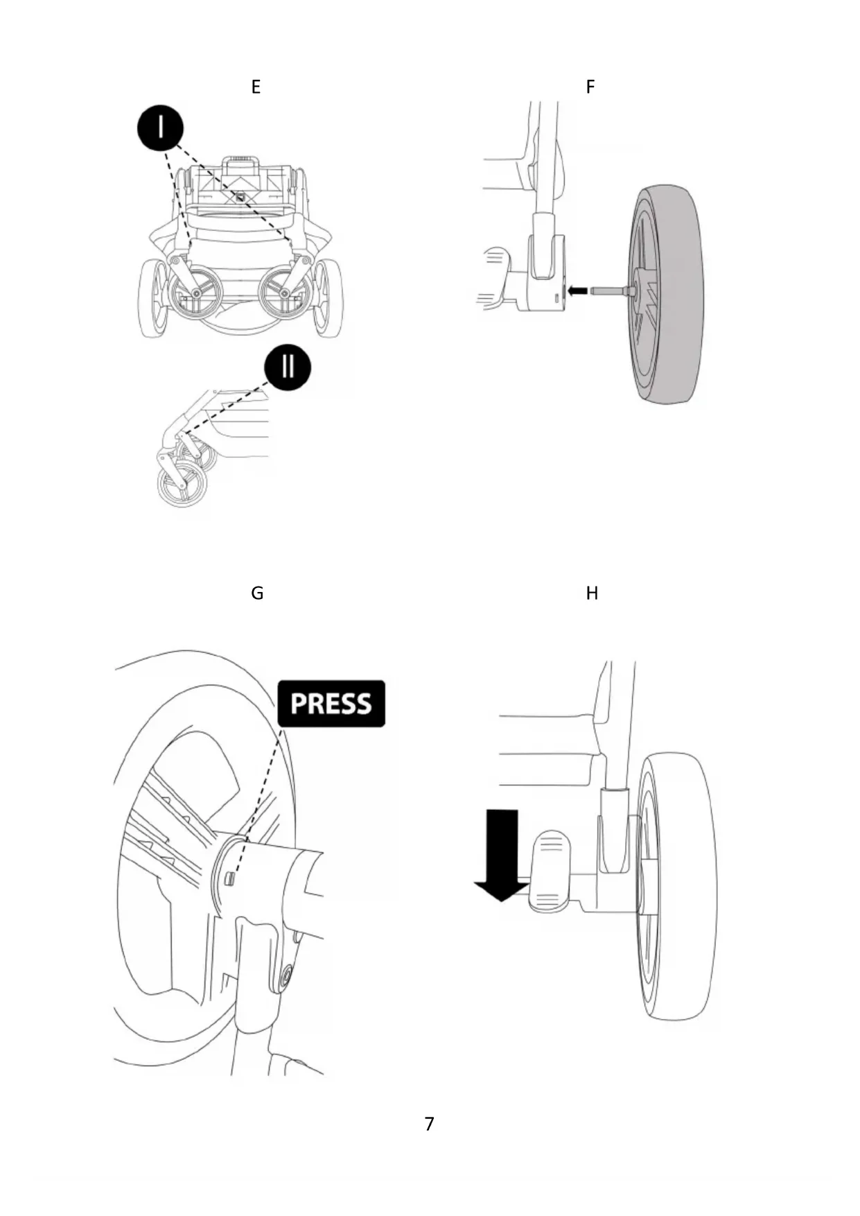 EN27 Set the frame (1) with a basket (2) on a flat surface with the handle upwards. Release the locking element (PIC.A), press the folding button (PIC.W.I), and hold it while unfolding the pushchair’s frame upwards (PIC.B) until you hear a characteristic locking sound (PIC.C). III MOUNTING AND DISMOUNTING OF FRONT WHEELS Slide in the front wheels (3) into designated slots until you hear a locking sound (PIC.D). To release the wheel, press the button and pull out the wheel (PIC.E.I). The pushchair has a pivoting front wheels system with an option of lock to ride straight. To unlock, slide the lock up/down (PIC.E.II). IV MOUNTING AND DISMOUNTING OF REAR WHEELS Slide in the rear wheels (4) into a designated slots until you hear a locking sound (PIC.F ). To realease the wheel, press the buton and pull out the wheel ( PIC.G). WARNING! Before using the pushchair, make sure all wheels are correctly fitted.