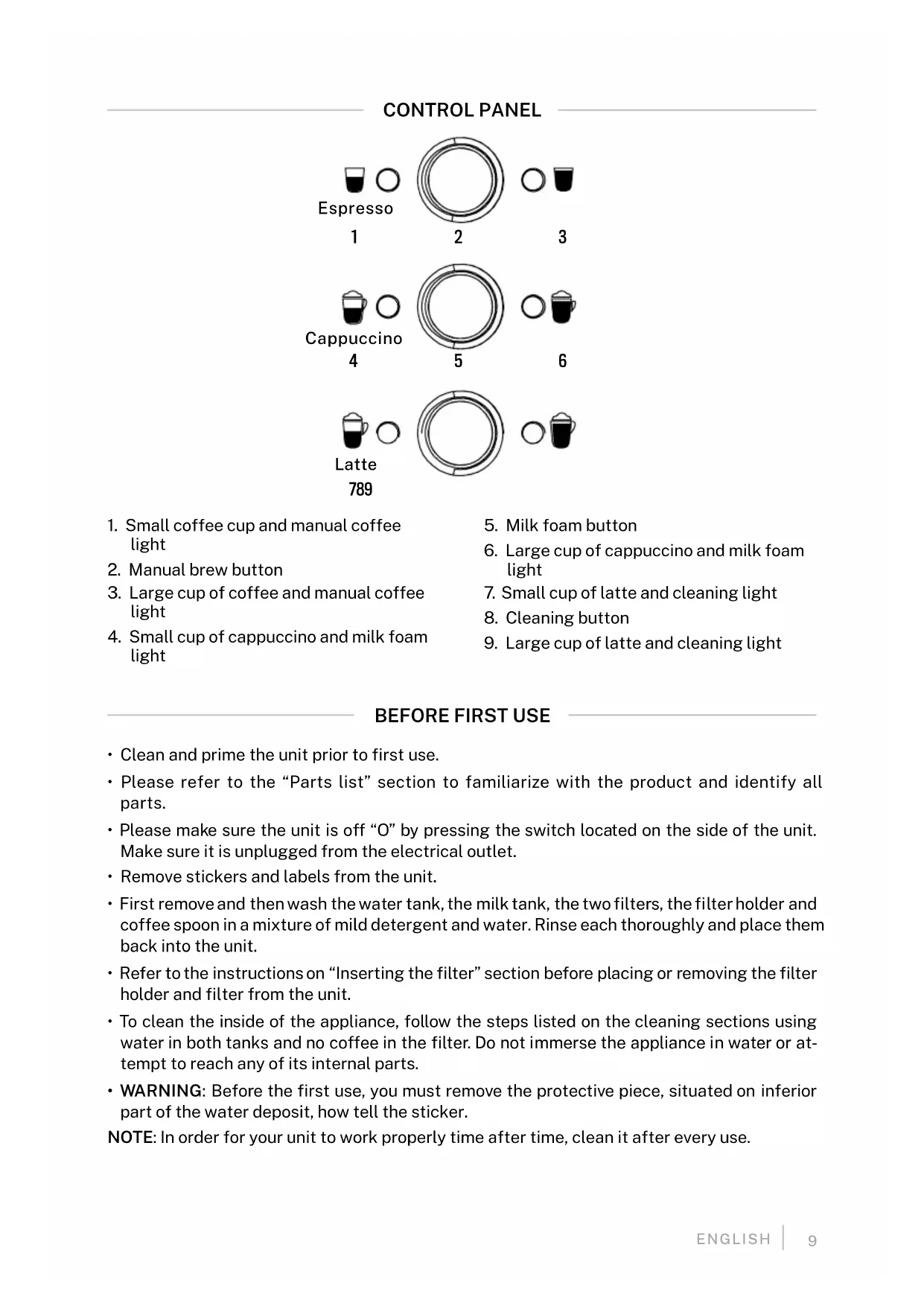 - Pressure: In order to avoid possible burns to body parts and/or other in- jury from hot steam and water or damages to the unit, never remove the water tank or the porta-lter while your espresso/cappuccino maker is brewing coffee or frothing. Make sure the three lights are on before you can remove the porta-lter to make additional cups of coffee. If you need to add more water or milk to the tanks, please make sure the three lights are on and ensure to switch off the unit by pressing the red button on the side of the unit to the off position “O”.8 ENGLISH PARTS LIST