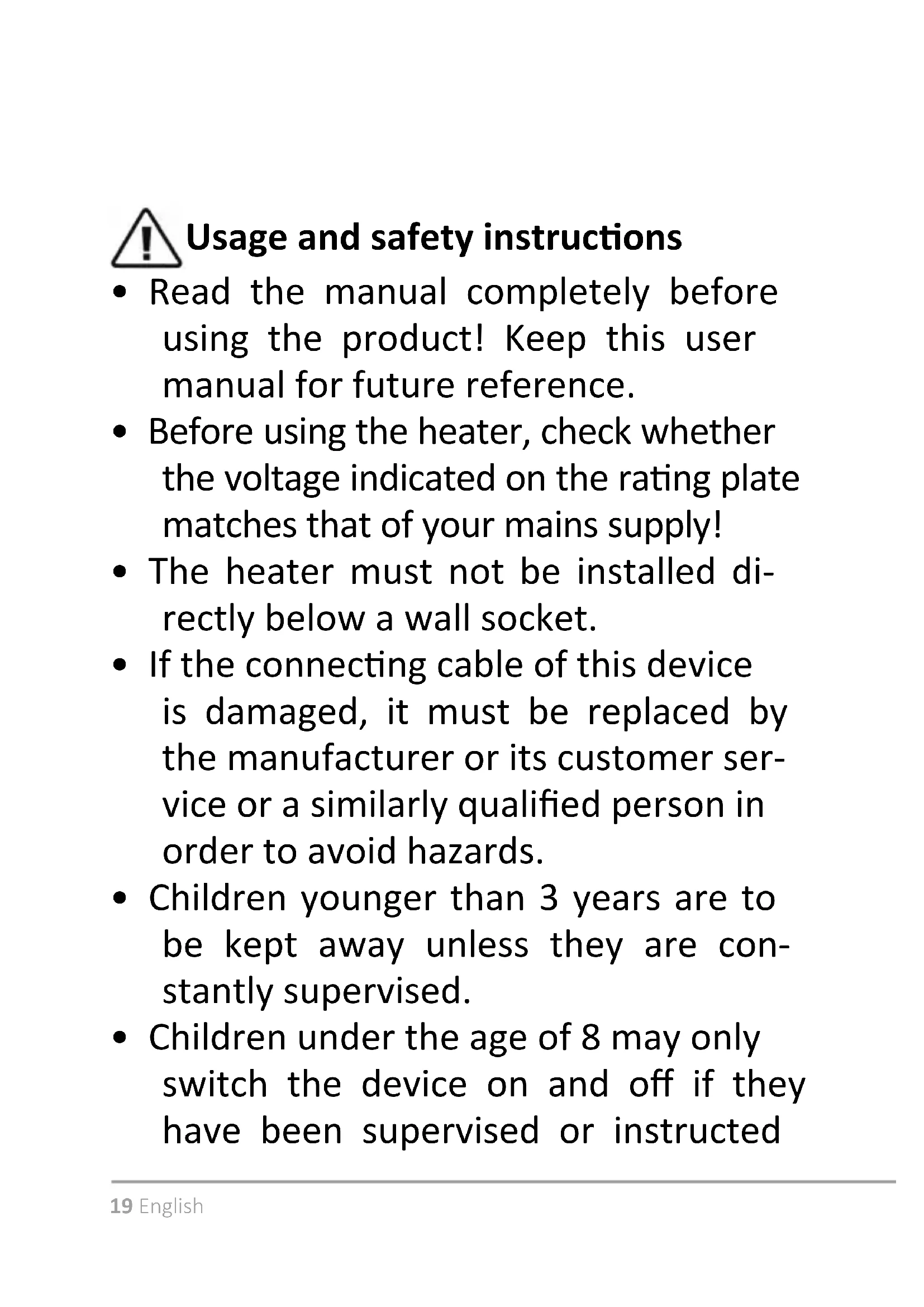 - Cauon! The fan heater is not suitable to be used in conned areas if they are occupied by persons who are not able to leave the room or the vehicle by themselves.