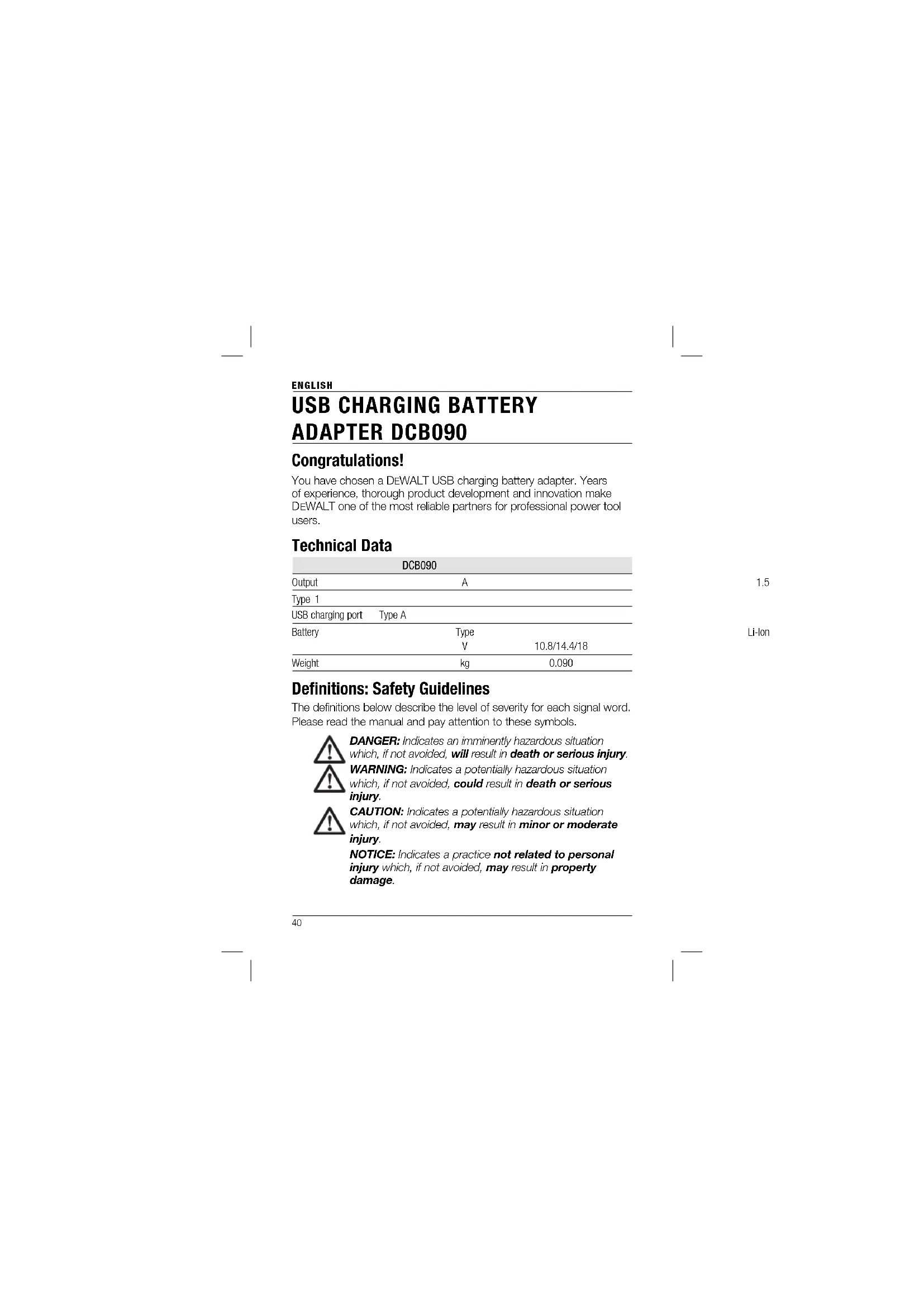 EWALT one of the most reliable partners for professional power tool users. Technical Data DCB090 Output A 1.5 Type 1 USB charging port Type A Battery Type Li-Ion V 10.8/14.4/18 Weight kg 0.090 Defi nitions: Safety Guidelines The definitions below describe the level of severity for each signal word. Please read the manual and pay attention to these symbols.