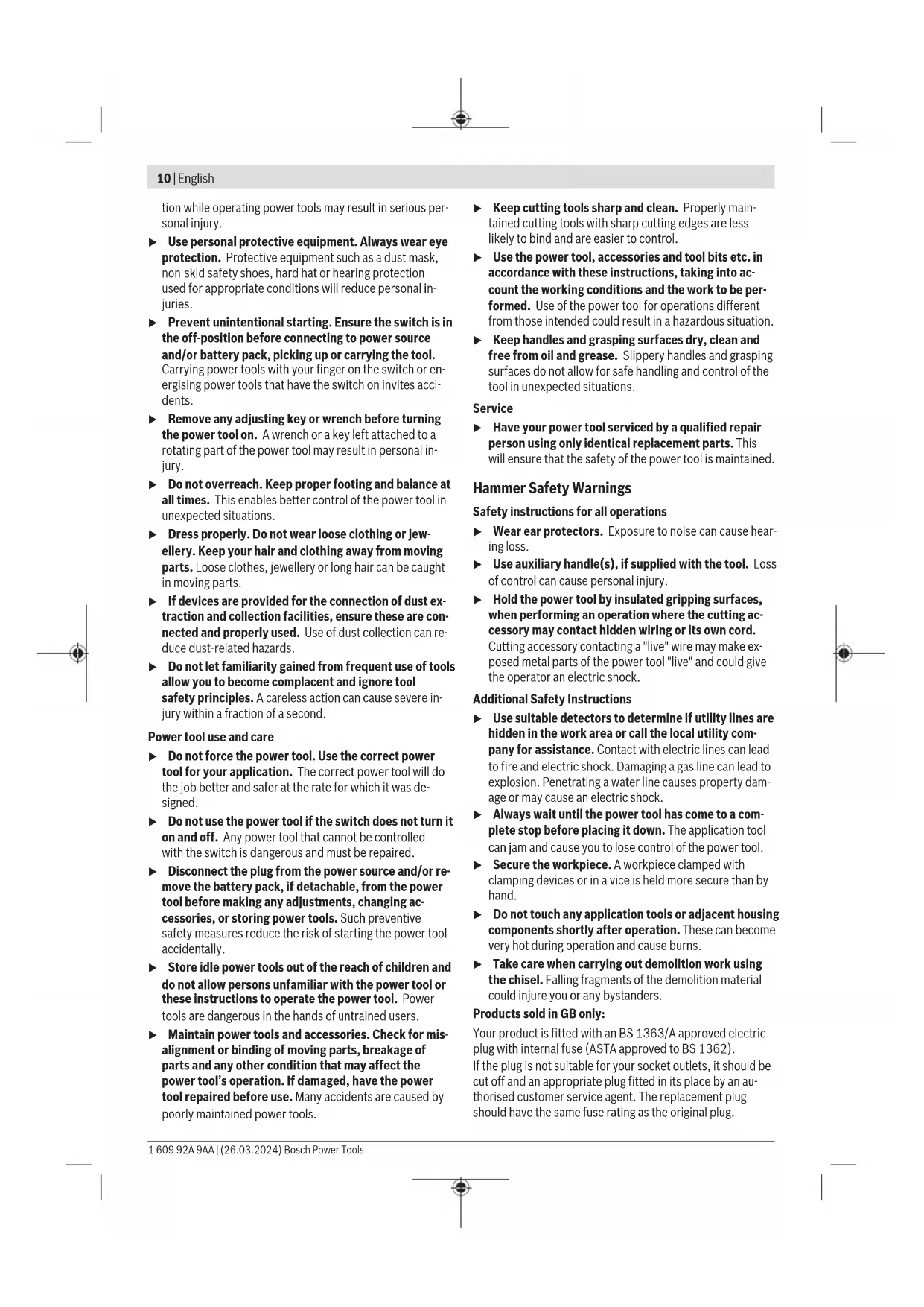 äußeren Abmessung größer als 25cm sind, im Einzel- handelsgeschäft oder in unmittelbarer Nähe hierzu un- entgeltlich zurückzunehmen; die Rücknahme darf nicht an den Kauf eines Elektro- oder Elektronikgerätes ge- knüpft werden und ist auf drei Altgeräte pro Geräteart beschränkt. Der Vertreiber hat beim Abschluss des Kaufvertrags für das neue Elektro- oder Elektronikgerät den Endnutzer über die Möglichkeit zur unentgeltlichen Rückgabe bzw. Abholung des Altgeräts zu informieren und den Endnutzer nach seiner Absicht zu befragen, ob bei der Auslieferung des neuen Ge- räts ein Altgerät zurückgegeben wird. Dies gilt auch bei Vertrieb unter Verwendung von Fernkom- munikationsmitteln, wenn die Lager- und Versandflächen für Elektro- und Elektronikgeräte mindestens 400m² betragen oder die gesamten Lager- und Versandflächen mindestens 800m² betragen, wobei die unentgeltliche Abholung auf Elektro- und Elektronikgeräte der Kategorien 1 (Wärmeüber- träger), 2 (Bildschirmgeräte) und 4 (Großgeräte mit mindes- tens einer äußeren Abmessung über 50cm) beschränkt ist. Für alle übrigen Elektro- und Elektronikgeräte muss der Ver- treiber geeignete Rückgabemöglichkeiten in zumutbarer Ent- fernung zum jeweiligen Endnutzer gewährleisten; das gilt auch für Altgeräte, die in keiner äußeren Abmessung größer als 25cm sind, die der Endnutzer zurückgeben will, ohne ein neues Gerät zu kaufen. English Safety instructions General Power Tool Safety Warnings WARNING Read all safety warnings, instruc- tions, illustrations and specifica- tions provided with this power tool. Failure to follow all in- structions listed below may result in electric shock, fire and/ or serious injury. Save all warnings and instructions for future reference. The term "power tool" in the warnings refers to your mains- operated (corded) power tool or battery-operated (cord- less) power tool. Work area safety u Keep work area clean and well lit. Cluttered or dark areas invite accidents. u Do not operate power tools in explosive atmospheres, such as in the presence of flammable liquids, gases or dust. Power tools create sparks which may ignite the dust or fumes. u Keep children and bystanders away while operating a power tool. Distractions can cause you to lose control. Electrical safety u Power tool plugs must match the outlet. Never modify the plug in any way. Do not use any adapter plugs with earthed (grounded) power tools. Unmodified plugs and matching outlets will reduce risk of electric shock. u Avoid body contact with earthed or grounded sur- faces, such as pipes, radiators, ranges and refrigerat- ors. There is an increased risk of electric shock if your body is earthed or grounded. u Do not expose power tools to rain or wet conditions. Water entering a power tool will increase the risk of elec- tric shock. u Do not abuse the cord. Never use the cord for carry- ing, pulling or unplugging the power tool. Keep cord away from heat, oil, sharp edges or moving parts. Damaged or entangled cords increase the risk of electric shock. u When operating a power tool outdoors, use an exten- sion cord suitable for outdoor use. Use of a cord suit- able for outdoor use reduces the risk of electric shock. u If operating a power tool in a damp location is un- avoidable, use a residual current device (RCD) protec- ted supply. Use of an RCD reduces the risk of electric shock. Personal safety u Stay alert, watch what you are doing and use common sense when operating a power tool. Do not use a power tool while you are tired or under the influence of drugs, alcohol or medication. A moment of inatten- Bosch Power Tools 1 609 92A 9AA | (26.03.2024)10 | English tion while operating power tools may result in serious per- sonal injury. u Use personal protective equipment. Always wear eye protection. Protective equipment such as a dust mask, non-skid safety shoes, hard hat or hearing protection used for appropriate conditions will reduce personal in- juries. u Prevent unintentional starting. Ensure the switch is in the off-position before connecting to power source and/or battery pack, picking up or carrying the tool. Carrying power tools with your finger on the switch or en- ergising power tools that have the switch on invites acci- dents. u Remove any adjusting key or wrench before turning the power tool on. A wrench or a key left attached to a rotating part of the power tool may result in personal in- jury. u Do not overreach. Keep proper footing and balance at all times. This enables better control of the power tool in unexpected situations. u Dress properly. Do not wear loose clothing or jew- ellery. Keep your hair and clothing away from moving parts. Loose clothes, jewellery or long hair can be caught in moving parts. u If devices are provided for the connection of dust ex- traction and collection facilities, ensure these are con- nected and properly used. Use of dust collection can re- duce dust-related hazards. u Do not let familiarity gained from frequent use of tools allow you to become complacent and ignore tool safety principles. A careless action can cause severe in- jury within a fraction of a second. Power tool use and care u Do not force the power tool. Use the correct power tool for your application. The correct power tool will do the job better and safer at the rate for which it was de- signed. u Do not use the power tool if the switch does not turn it on and off. Any power tool that cannot be controlled with the switch is dangerous and must be repaired. u Disconnect the plug from the power source and/or re- move the battery pack, if detachable, from the power tool before making any adjustments, changing ac- cessories, or storing power tools. Such preventive safety measures reduce the risk of starting the power tool accidentally. u Store idle power tools out of the reach of children and do not allow persons unfamiliar with the power tool or these instructions to operate the power tool. Power tools are d
