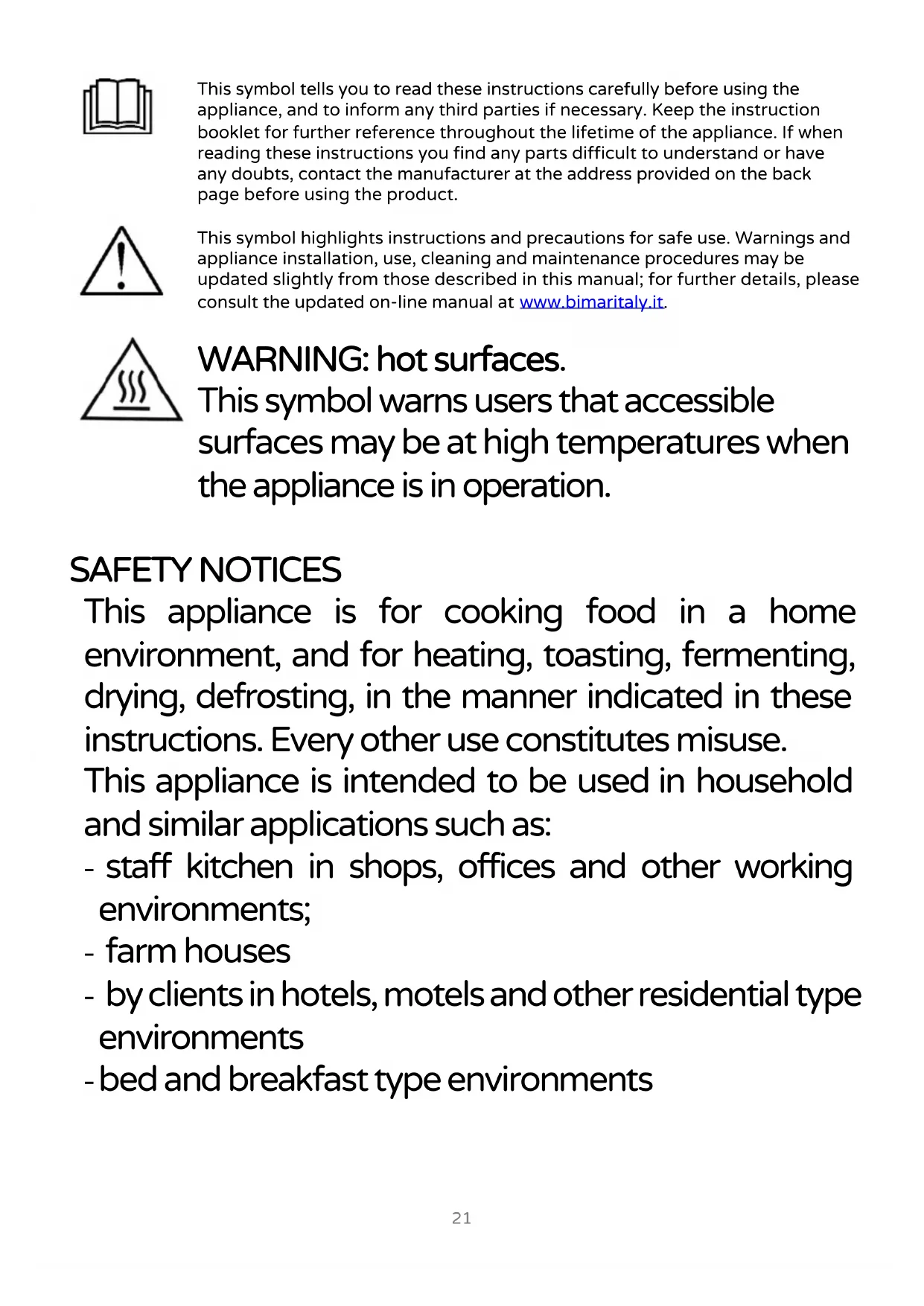 This symbol highlights instructions and precautions for safe use. Warnings and appliance installation, use, cleaning and maintenance procedures may be updated slightly from those described in this manual; for further details, please consult the updated on-line manual at www.bimaritaly.it.