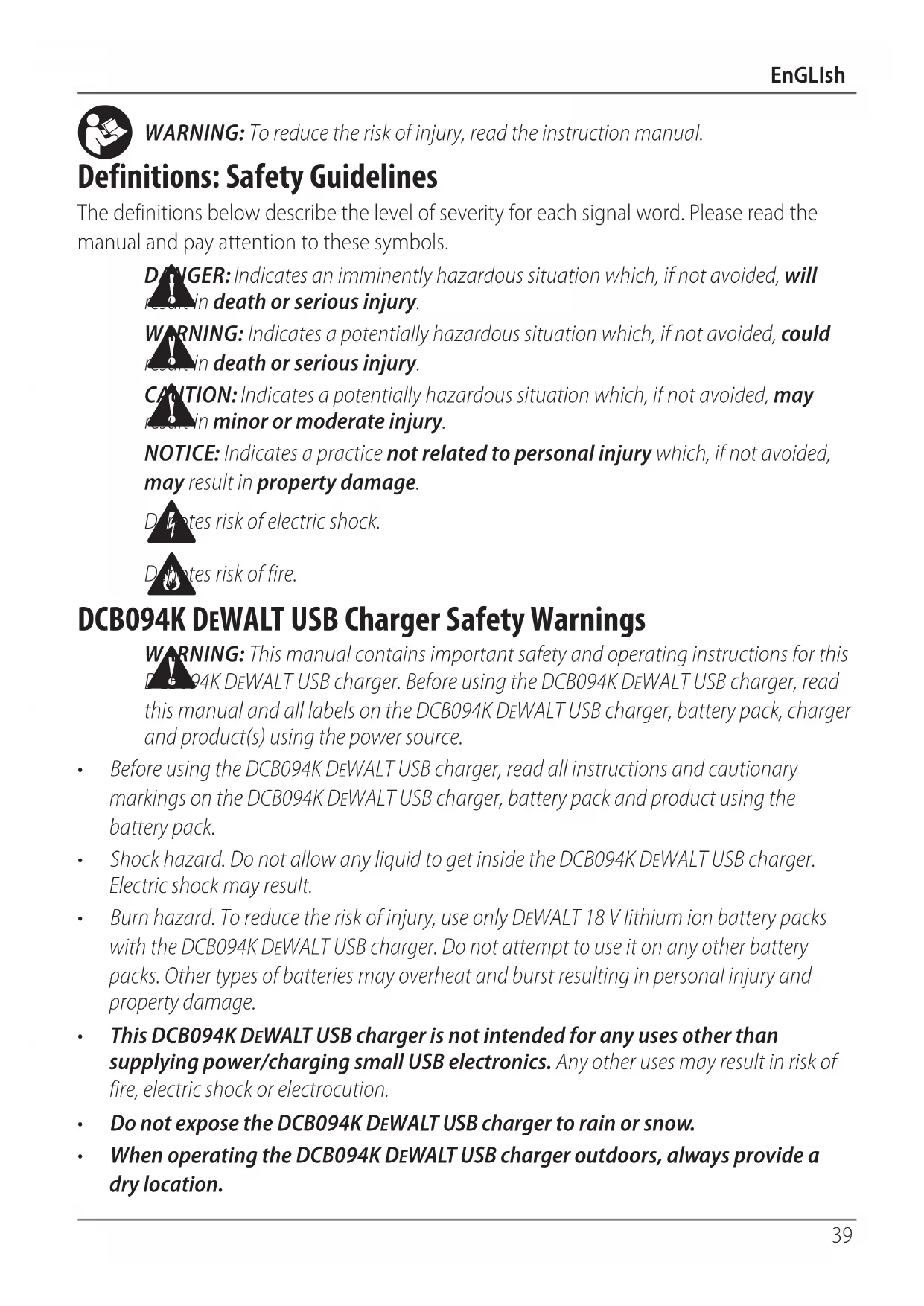 DCB094K DeWALT USB charger. Before using the DCB094K DeWALT USB charger, read this manual and all labels on the DCB094K DeWALT USB charger, battery pack, charger and product(s) using the powersource.