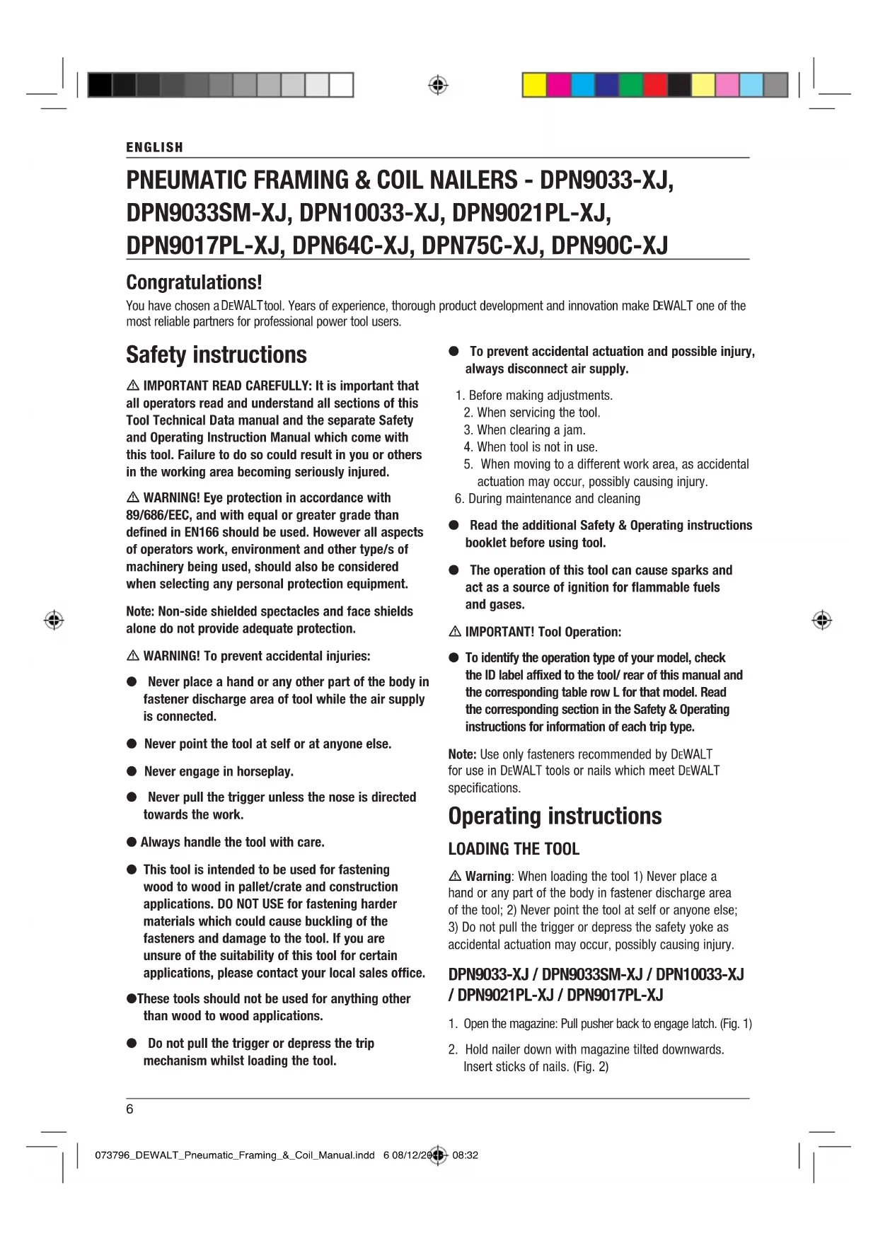 Insert sticks of nails. (Fig. 2) PNEUMATIC FRAMING & COIL NAILERS - DPN9033-XJ, DPN9033SM-XJ, DPN10033-XJ, DPN9021PL-XJ, DPN9017PL-XJ, DPN64C-XJ, DPN75C-XJ, DPN90C-XJ Congratulations! You have chosen a DeWALT tool. Years of experience, thorough product development and innovation make D