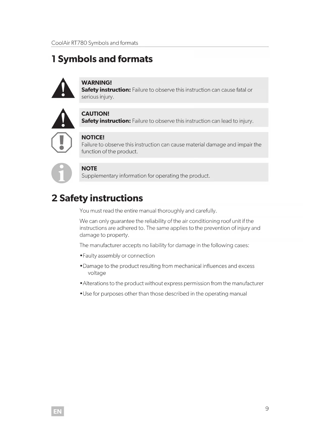 2 Safety instructions You must read the entire manual thoroughly and carefully. We can only guarantee the reliability of the air conditioning roof unit if the instructions are adhered to. The same applies to the prevention of injury and damage to property. The manufacturer accepts no liability for damage in the following cases: