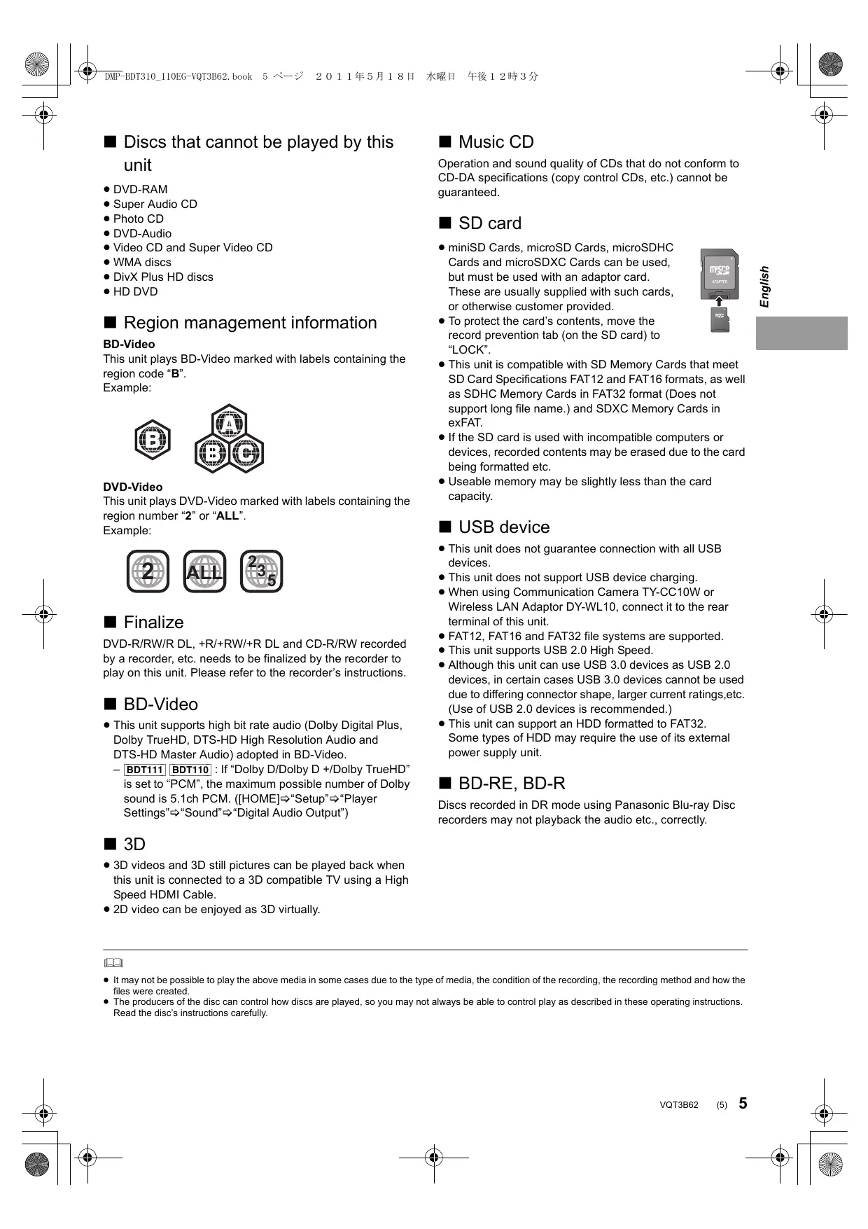 ∫ Music CD Operation and sound quality of CDs that do not conform to CD-DA specifications (copy control CDs, etc.) cannot be guaranteed. ∫ SD card ≥ miniSD Cards, microSD Cards, microSDHC Cards and microSDXC Cards can be used, but must be used with an adaptor card. These are usually supplied with such cards, or otherwise customer provided. ≥ To protect the card’s contents, move the record prevention tab (on the SD card) to “LOCK”. ≥ This unit is compatible with SD Memory Cards that meet SD Card Specifications FAT12 and FAT16 formats, as well as SDHC Memory Cards in FAT32 format (Does not support long file name.) and SDXC Memory Cards in exFAT. ≥ If the SD card is used with incompatible computers or devices, recorded contents may be erased due to the card being formatted etc. ≥ Useable memory may be slightly less than the card capacity. ∫ USB device ≥ This unit does not guarantee connection with all USB devices. ≥ This unit does not support USB device charging. ≥ When using Communication Camera TY-CC10W or Wireless LAN Adaptor DY-WL10, connect it to the rear terminal of this unit. ≥ FAT12, FAT16 and FAT32 file systems are supported. ≥ This unit supports USB 2.0 High Speed. ≥ Although this unit can use USB 3.0 devices as USB 2.0 devices, in certain cases USB 3.0 devices cannot be used due to differing connector shape, larger current ratings,etc. (Use of USB 2.0 devices is recommended.) ≥ This unit can support an HDD formatted to FAT32. Some types of HDD may require the use of its external power supply unit. ∫ BD-RE, BD-R Discs recorded in DR mode using Panasonic Blu-ray Disc recorders may not playback the audio etc., correctly. ∫ 3D ≥ 3D videos and 3D still pictures can be played back when this unit is connected to a 3D compatible TV using a High Speed HDMI Cable. ≥ 2D video can be enjoyed as 3D virtually. ≥ It may not be possible to play the above media in some cases due to the type of media, the condition of the recording, the recording method and how the files were created. ≥ The producers of the disc can control how discs are played, so you may not always be able to control play as described in these operating instructions. Read the disc’s instructions carefully. VQT3B62 (5)