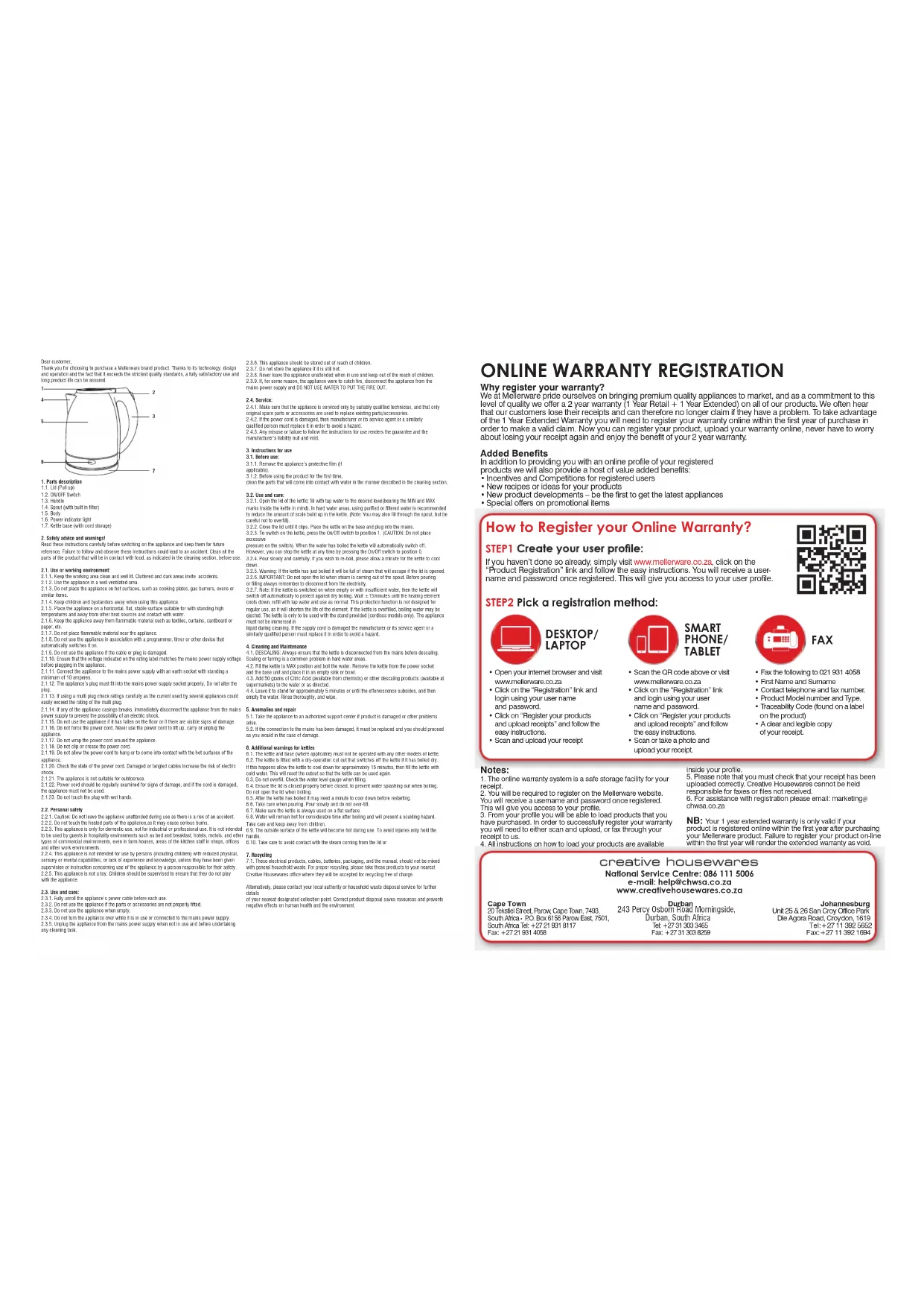 complies with INTERNATIONAL IEC60335 SAFETY SPECIFICATIONS 1500W RIO 1500W Cordless kettle Durban Tell: +27 31 303 3465 Fax: +27 31 303 8259 Johannesburg Unit 25 & 26 San Croy Office Park Die Agora Road, Croydon, 1619 Tell: +27 11 392 5652 Fax: +27 11 392 1694 243 Percy Osborn Road Morningside, Durban, South AfricaWhy register your warranty? We at Mellerware pride ourselves on bringing premium quality appliances to market, and as a commitment to this level of quality we offer a 2 year warranty (1 Year Retail + 1 Year Extended) on all of our products. We often hear that our customers lose their receipts and can therefore no longer claim if they have a problem. To take advantage of the 1 Year Extended Warranty you will need to register your warranty online within the first year of purchase in order to make a valid claim. Now you can register your product, upload your warranty online, never have to worry about losing your receipt again and enjoy the benefit of your 2 year warranty. Added Benefits In addition to providing you with an online profile of your registered products we will also provide a host of value added benefits: