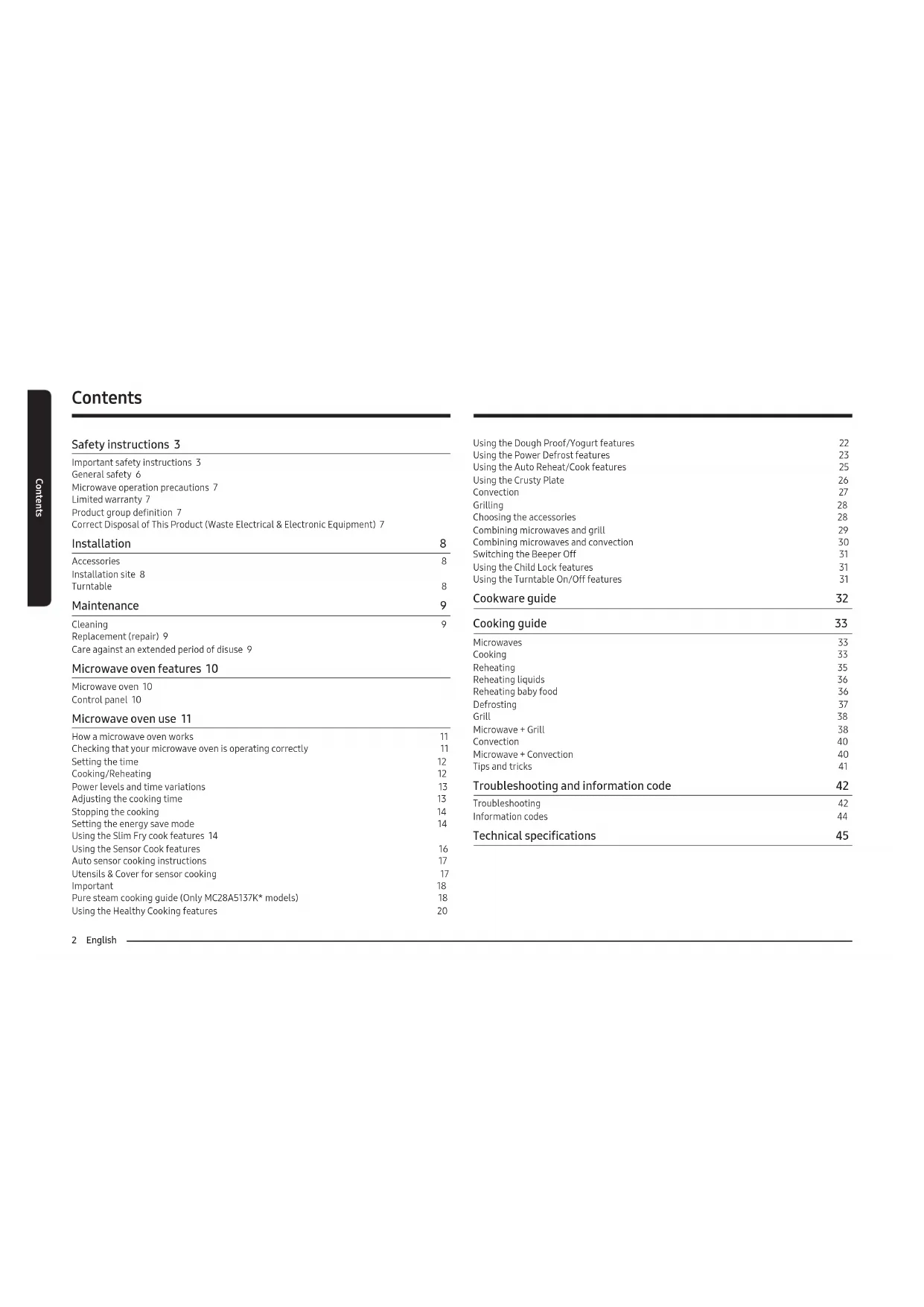 - (opłata według taryfy operatora) http://www.samsung.com/pl/support/ LITHUANIA 8-800-77777 www.samsung.com/lt/support LATVIA 8000-7267 www.samsung.com/lv/support ESTONIA 800-7267 www.samsung.com/ee/support UKRAINE 0-800-502-000 www.samsung.com/ua/support MOLDOVA +373-22-667-400 www.samsung.com/ua/support/moldova DE68-04699L-00Microwave oven User manual MC28A5137**2 English Contents Safety instructions 3 Important safety instructions 3 General safety 6 Microwave operation precautions 7 Limited warranty 7 Product group denition 7 Correct Disposal of This Product (Waste Electrical & Electronic Equipment) 7 Installation 8 Accessories 8 Installation site 8 Turntable 8 Maintenance 9 Cleaning 9 Replacement (repair) 9 Care against an extended period of disuse 9 Microwave oven features 10 Microwave oven 10 Control panel 10 Microwave oven use 11 How a microwave oven works 11 Checking that your microwave oven is operating correctly 11 Setting the time 12 Cooking/Reheating 12 Power levels and time variations 13 Adjusting the cooking time 13 Stopping the cooking 14 Setting the energy save mode 14 Using the Slim Fry cook features 14 Using the Sensor Cook features 16 Auto sensor cooking instructions 17 Utensils & Cover for sensor cooking 17 Important 18 Pure steam cooking guide (Only MC28A5137K* models) 18 Using the Healthy Cooking features 20 Contents Using the Dough Proof/Yogurt features 22 Using the Power Defrost features 23 Using the Auto Reheat/Cook features 25 Using the Crusty Plate 26 Convection 27 Grilling 28 Choosing the accessories 28 Combining microwaves and grill 29 Combining microwaves and convection 30 Switching the Beeper Off 31 Using the Child Lock features 31 Using the Turntable On/Off features 31 Cookware guide 32 Cooking guide 33 Microwaves 33 Cooking 33 Reheating 35 Reheating liquids 36 Reheating baby food 36 Defrosting 37 Grill 38 Microwave + Grill 38 Convection 40 Microwave + Convection 40 Tips and tricks 41 Troubleshooting and information code 42 Troubleshooting 42 Information codes 44 Technical specications 45English 3 Safety instructions Safety instructions