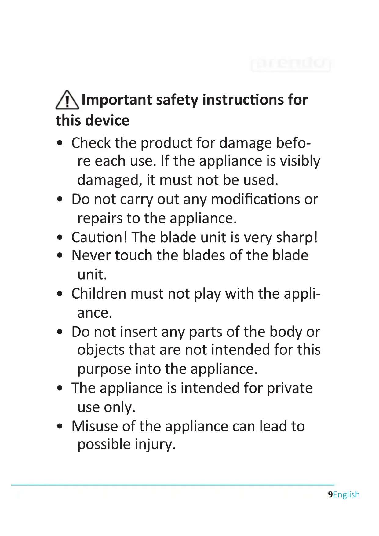 - The spice grinder is suitable for coarse salt and peppercorns.11English Thank you for purchasing a product from Arendo. Please read the following brief instrucons carefully so that you can enjoy your purchased appliance for a long me. Before using the delivered goods, please check that they are complete, free of defects and undamaged.