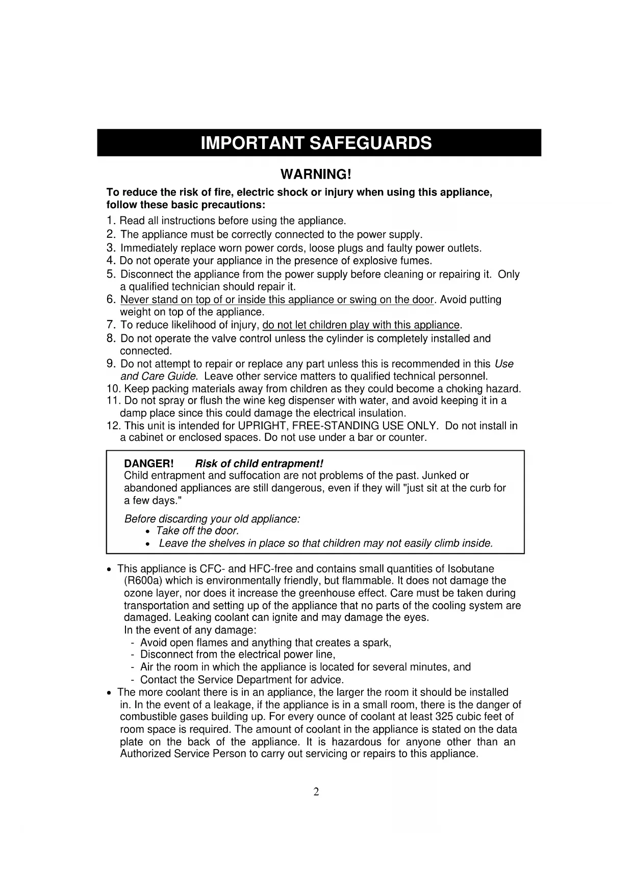 a cabinet or enclosed spaces. Do not use under a bar or counter. DANGER! Risk of child entrapment! Child entrapment and suffocation are not problems of the past. Junked or abandoned appliances are still dangerous, even if they will "just sit at the curb for a few days." Before discarding your old appliance: Take off the door. Leave the shelves in place so that children may not easily climb inside. This appliance is CFC- and HFC-free and contains small quantities of Isobutane (R600a) which is environmentally friendly, but flammable. It does not damage the ozone layer, nor does it increase the greenhouse effect. Care must be taken during transportation and setting up of the appliance that no parts of the cooling system are damaged. Leaking coolant can ignite and may damage the eyes. In the event of any damage: - Avoid open flames and anything that creates a spark, - Disconnect from the electrical power line, - Air the room in which the appliance is located for several minutes, and - Contact the Service Department for advice. The more coolant there is in an appliance, the larger the room it should be installed in. In the event of a leakage, if the appliance is in a small room, there is the danger of combustible gases building up. For every ounce of coolant at least 325 cubic feet of room space is required. The amount of coolant in the appliance is stated on the data plate on the back of the appliance. It is hazardous for anyone other than an Authorized Service Person to carry out servicing or repairs to this appliance.3 Take serious care when handling, moving, and using the appliance to avoid either damaging the refrigerant tubing or increasing the risk of a leak. Replacing component parts and servicing shall be done by factory authorized service personnel so as to minimize the risk of possible ignition due to incorrect parts or improper service.