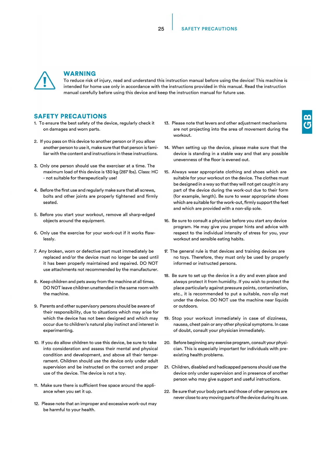 suitable for your workout on the device. The clothes must be designed in a way so that they will not get caught in any part of the device during the work-out due to their form (for example, length). Be sure to wear appropriate shoes which are suitable for the work-out, rmly support the feet and which are provided with a non-slip sole.