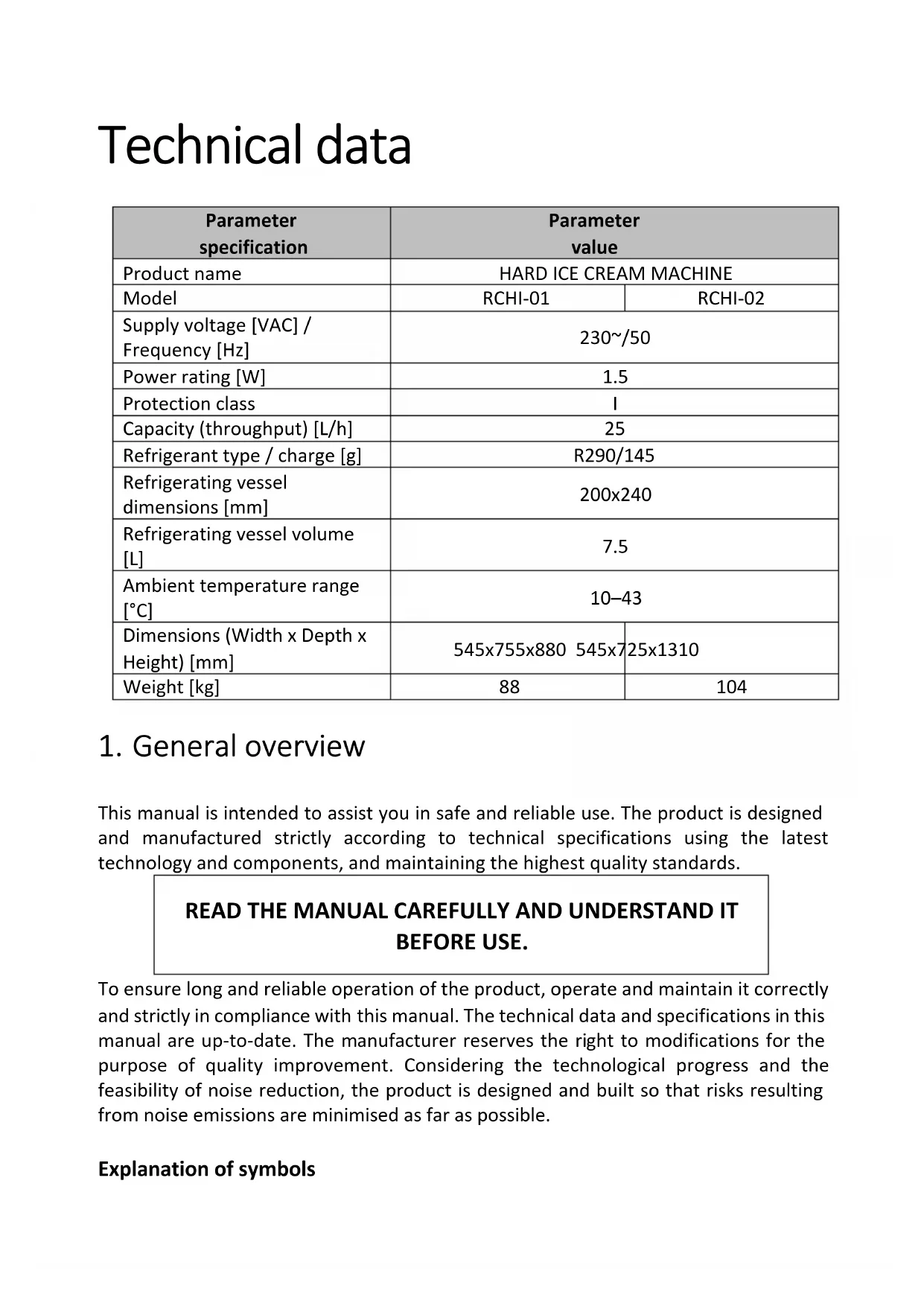 This manual is intended to assist you in safe and reliable use. The product is designed and manufactured strictly according to technical specifications using the latest technology and components, and maintaining the highest quality standards. READ THE MANUAL CAREFULLY AND UNDERSTAND IT BEFORE USE. To ensure long and reliable operation of the product, operate and maintain it correctly and strictly in compliance with this manual. The technical data and specifications in this manual are up-to-date. The manufacturer reserves the right to modifications for the purpose of quality improvement. Considering the technological progress and the feasibility of noise reduction, the product is designed and built so that risks resulting from noise emissions are minimised as far as possible. Explanation of symbolsThe product meets the requirements of relevant safety standards. Read the manual before use.
