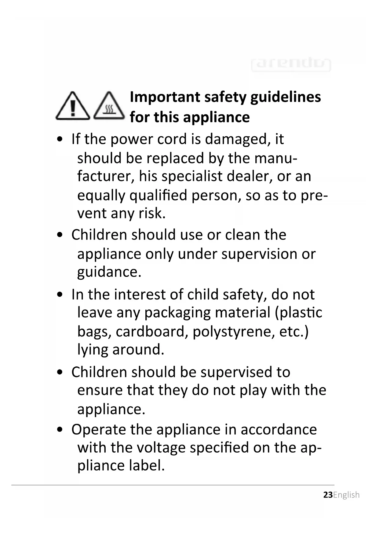 - Do not cover the air outlet of the appliance.28 English Thank you for choosing an Arendo product. Please read the following user manual carefully so that you can enjoy the purchased product. Before using the product, rst check that the delivered item is complete, accurate and undamaged.
