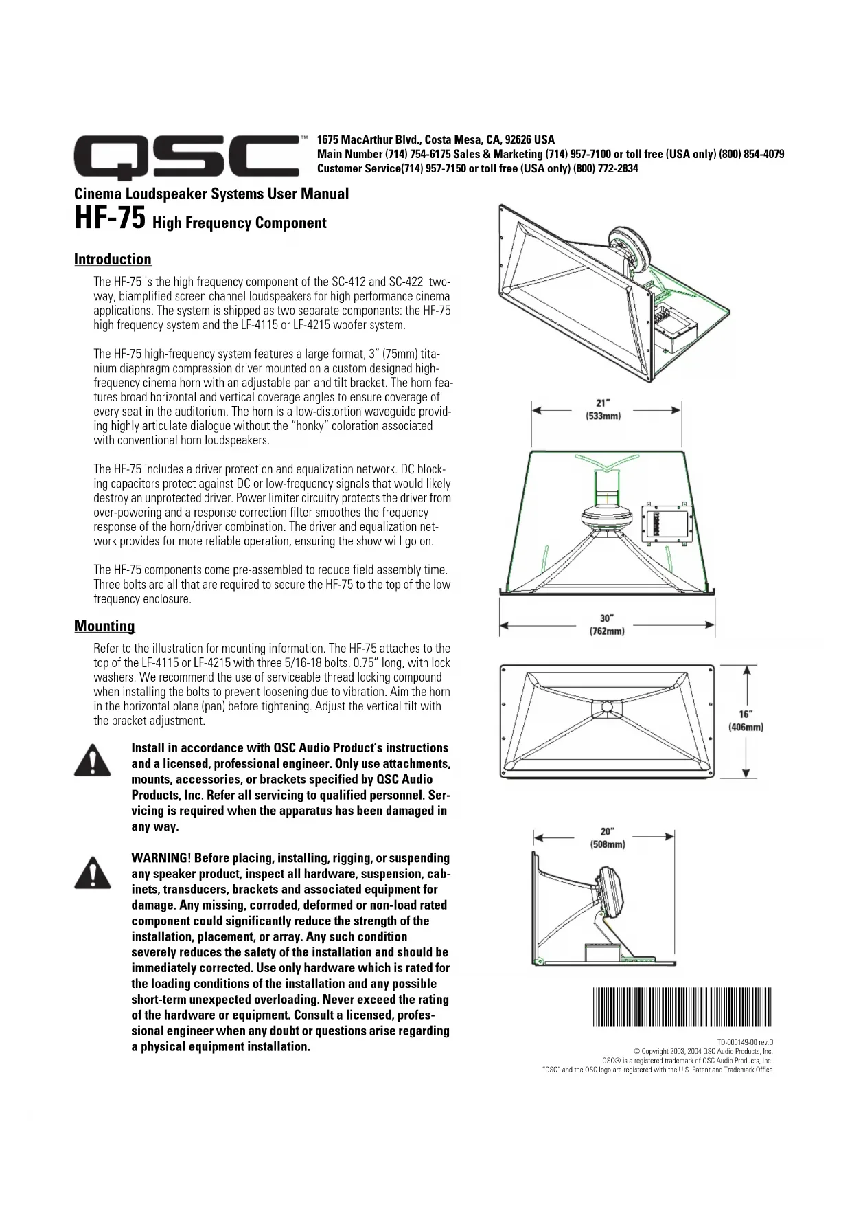 Cinema Loudspeaker Systems User Manual HF-75 High Frequency Component Introduction The HF-75 is the high frequency component of the SC-412 and SC-422 two- way, biamplified screen channel loudspeakers for high performance cinema applications. The system is shipped as two separate components: the HF-75 high frequency system and the LF-4115 or LF-4215 woofer system. The HF-75 high-frequency system features a large format, 3” (75mm) tita- nium diaphragm compression driver mounted on a custom designed high- frequency cinema horn with an adjustable pan and tilt bracket. The horn fea- tures broad horizontal and vertical coverage angles to ensure coverage of every seat in the auditorium. The horn is a low-distortion waveguide provid- ing highly articulate dialogue without the “honky” coloration associated with conventional horn loudspeakers. The HF-75 includes a driver protection and equalization network. DC block- ing capacitors protect against DC or low-frequency signals that would likely destroy an unprotected driver. Power limiter circuitry protects the driver from over-powering and a response correction filter smoothes the frequency response of the horn/driver combination. The driver and equalization net- work provides for more reliable operation, ensuring the show will go on. The HF-75 components come pre-assembled to reduce field assembly time. Three bolts are all that are required to secure the HF-75 to the top of the low frequency enclosure. Mounting Refer to the illustration for mounting information. The HF-75 attaches to the top of the LF-4115 or LF-4215 with three 5/16-18 bolts, 0.75” long, with lock washers. We recommend the use of serviceable thread locking compound when installing the bolts to prevent loosening due to vibration. Aim the horn in the horizontal plane (pan) before tightening. Adjust the vertical tilt with the bracket adjustment. Install in accordance with QSC Audio Product’s instructions and a licensed, professional engineer. Only use attachments, mounts, accessories, or brackets specified by QSC Audio Products, Inc. Refer all servicing to qualified personnel. Ser- vicing is required when the apparatus has been damaged in any way. WARNING! Before placing, installing, rigging, or suspending any speaker product, inspect all hardware, suspension, cab- inets, transducers, brackets and associated equipment for damage. Any missing, corroded, deformed or non-load rated component could significantly reduce the strength of the installation, placement, or array. Any such condition severely reduces the safety of the installation and should be immediately corrected. Use only hardware which is rated for the loading conditions of the installation and any possible short-term unexpected overloading. Never exceed the rating of the hardware or equipment. Consult a licensed, profes- sional engineer when any doubt or questions arise regarding a physical equipment installation. TD-000149-00 rev.D© Copyright 2003, 2004 QSC Audio Products, Inc.QSC® is a registered trademark of QSC Audio Products, Inc.“QSC” and the QSC logo are registered with the U.S. Patent and Trademark Office 1675 MacArthur Blvd., Costa Mesa, CA, 92626 USA Main Number (714) 754-6175 Sales & Marketing (714) 957-7100 or toll free (USA only) (800) 854-4079 Customer Service(714) 957-7150 or toll free (USA only) (800) 772-2834Connections The HF-75 has barrier strip screw terminals that accept up to #10 AWG stranded loudspeaker wire. HF INPUT Terminals Connect the amplifier’s output signal to the loudspeaker’s HF INPUT terminals. Observe proper polarity; amplifier + signal to loud- speaker + HF INPUT, amplifier - signal to loudspeaker - HF INPUT. Use the largest wire size and shortest length for the application. NOTE! Do not apply full range signal to the HF-75! There is no crossover in the HF-75, only a compensation/ delay network. All required signal processing must be done upstream of the HF-75. Maintain proper loud- speaker connection polarity throughout the entire system for maximum performance. HF OUTPUT Terminals The HF OUTPUT terminals are factory-connected to the compression driver. These terminals should ONLY be connected to the HF- 75’s compression driver. QSC DCM or other active crossover HF-75 compression driver Amplifier Processed high frequency program signal HF-75 connec- tion terminals Note: The HF-75 connection enclosure does not contain a crossover network! Ensure only high frequency signal is applied to HF INPUT termi- nals or compression driver damage will occur.HF-75 Specifications (subject to change without notice) Frequency Range: 600 - 16k Hz (-6 dB, full space) Nominal Coverage: 90° horizontal X +15° to -35° vertical (50° total, adjustable mount provides for vertical plane adjustments. The horizontal plane can be adjusted by altering mounting position on the LF-4215 enclosure before tightening bolts. DI: 9.0 dB (600 to 16,000 Hertz average) Q: 8.0 (600 to 16,000 Hertz average) Maximum Output: 133 dB SPL calculated peak, 1 meter, half space. Impedance: 8 ohms nominal