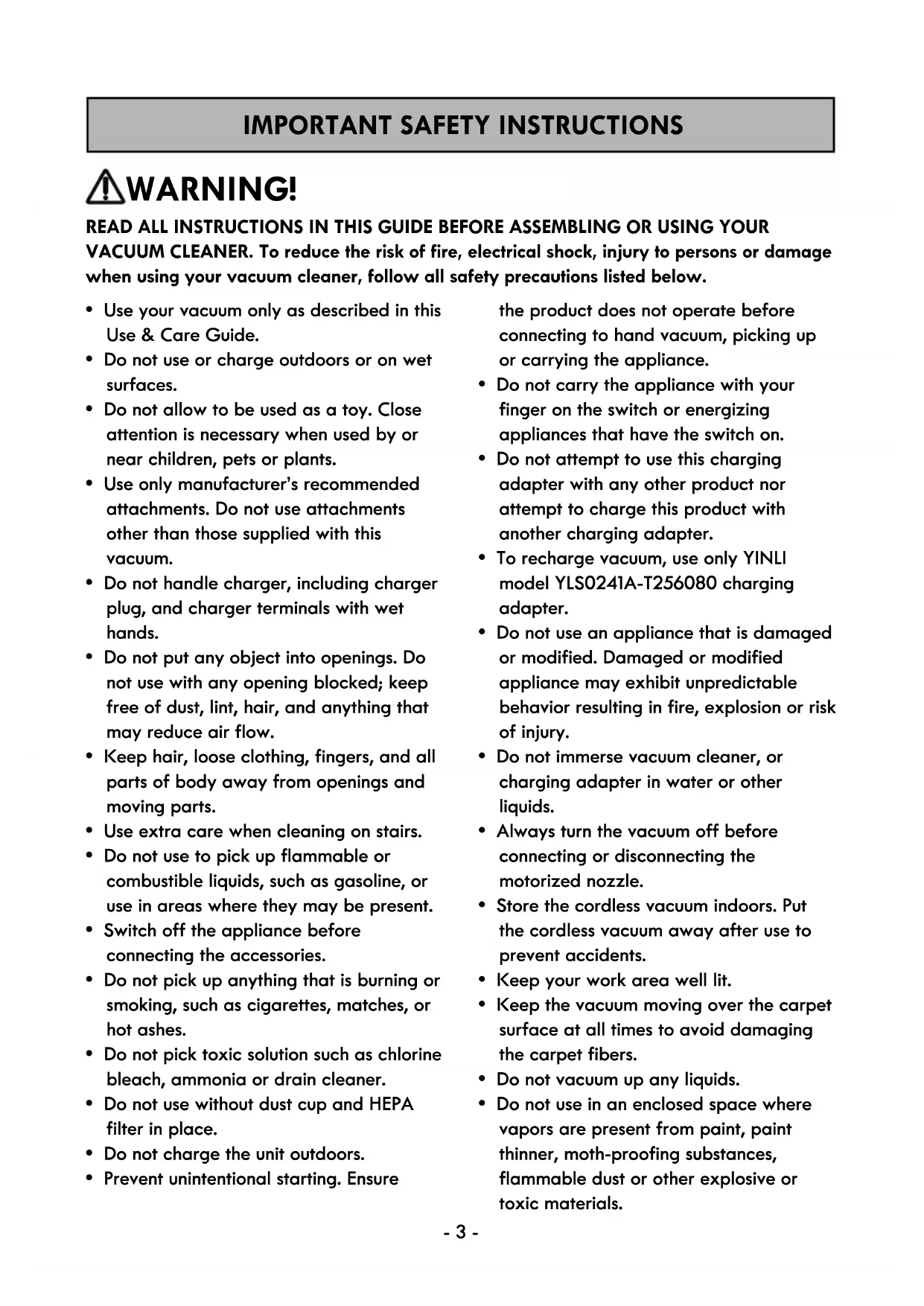 - To recharge vacuum, use only YINLI model YLS0241A-T256080 charging adapter.