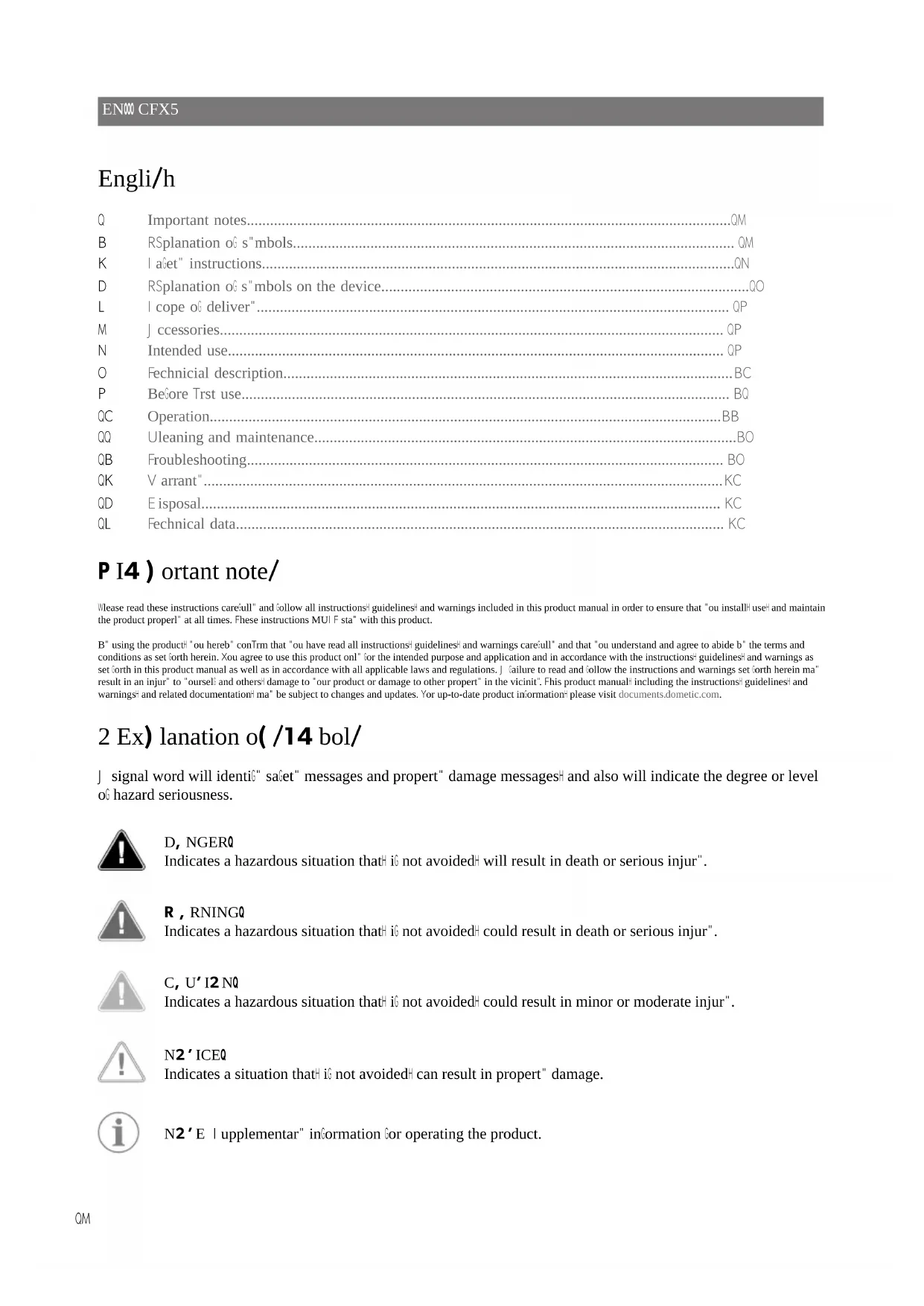 - 15 Technical data 1 Important notes Please read these instructions carefully and follow all instructions, guidelines, and warnings included in this product manual in order to ensure that you install, use, and maintain the product properly at all times. These instructions MUST stay with this product. By using the product, you hereby confirm that you have read all instructions, guidelines, and warnings carefully and that you understand and agree to abide by the terms and conditions as set forth herein. You agree to use this product only for the intended purpose and application and in accordance with the instructions, guidelines, and warnings as set forth in this product manual as well as in accordance with all applicable laws and regulations. A failure to read and follow the instructions and warnings set forth herein may result in an injury to yourself and others, damage to your product or damage to other property in the vicinity. This product manual, including the instructions, guidelines, and warnings, and related documentation, may be subject to changes and updates. For up-to-date product information, please visit documents.dometic.com. 2 Explanation of symbols A signal word will identify safety messages and property damage messages, and also will indicate the degree or level of hazard seriousness. DANGER! Indicates a hazardous situation that, if not avoided, will result in death or serious injury. WARNING! Indicates a hazardous situation that, if not avoided, could result in death or serious injury. CAUTION! Indicates a hazardous situation that, if not avoided, could result in minor or moderate injury. NOTICE! Indicates a situation that, if not avoided, can result in property damage. NOTE Supplementary information for operating the product. 16CFX5EN 3 Safety instructions DANGER! Electrocution hazard On boats: If the device is powered by the mains, ensure that the power supply has a residual current device (RCD), a residual current circuit breaker (RCCB), or a ground fault circuit interrupter (GFCI). Installation, especially in potentially damp areas, must be in accordance with all applicable installation regulations. Do not touch exposed cables with your bare hands. This applies especially when operating the device from the AC mains. Before starting the device, ensure that the power supply line and the plug are dry. WARNING! Explosion hazard Do not store any explosive substances such as spray cans with a flammable propellant in the cooling device. WARNING! Electrocution hazard Do not operate the cooling device if it is visibly damaged. If the cooling device's power cable is damaged, it must be replaced with a suitable power cable or assembly available from the manufacturer or its service agent to prevent safety hazard. This cooling device may only be repaired by qualified personnel. Improper repairs can lead to considerable hazards. Plug the device to sockets that ensure proper connection especially when the device needs to be earthed. WARNING! Fire hazard When positioning the cooling device, ensure that the supply cord is not trapped or damaged. Do not locate multiple portable socket-outlets or portable power supplies at the rear of the device. In the event of any damage to the refrigerant circuit: p. 30