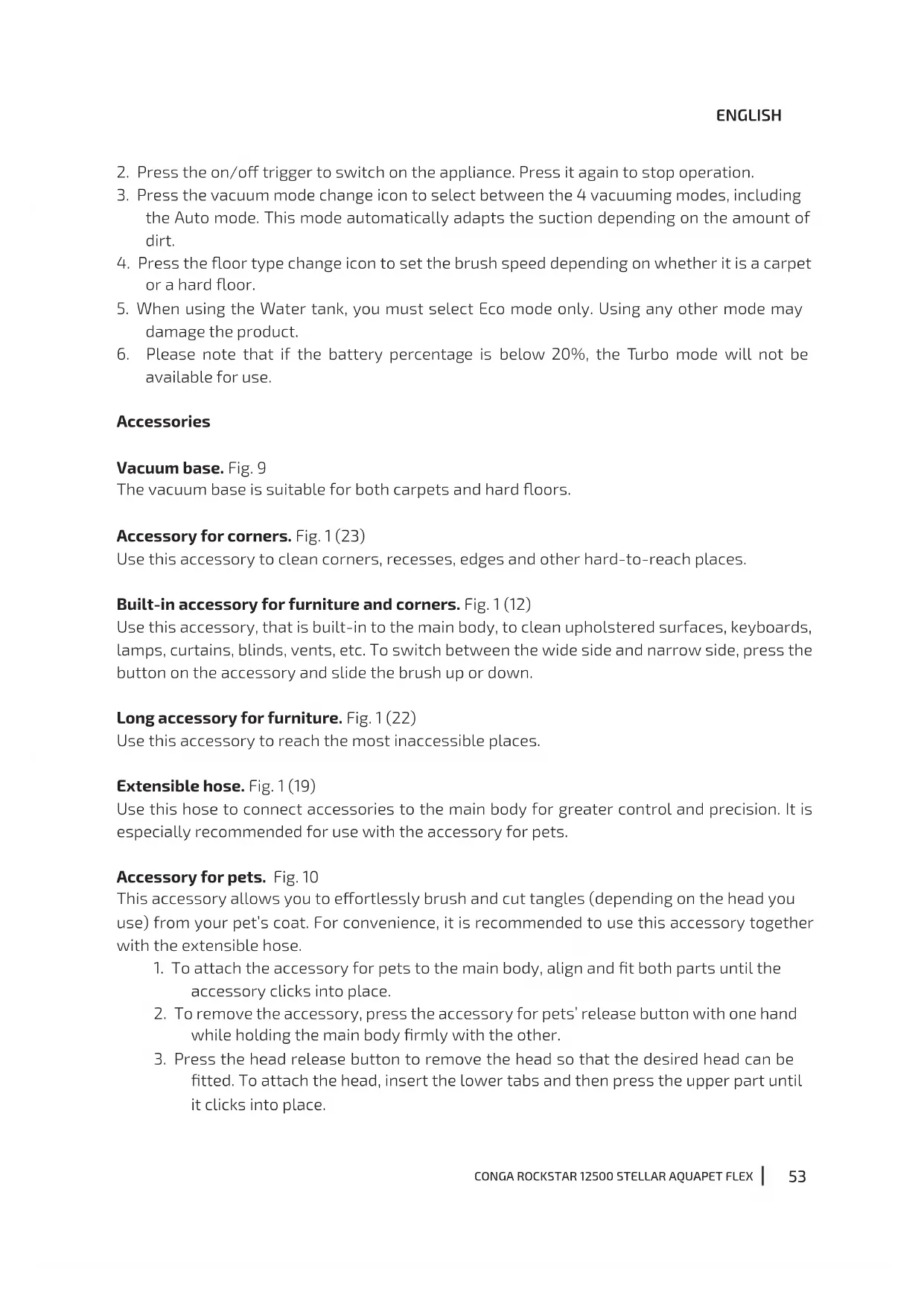 available for use. Accessories Vacuum base. Fig. 9 The vacuum base is suitable for both carpets and hard oors. Accessory for corners. Fig. 1 (23) Use this accessory to clean corners, recesses, edges and other hard-to-reach places. Built-in accessory for furniture and corners. Fig. 1 (12) Use this accessory, that is built-in to the main body, to clean upholstered surfaces, keyboards, lamps, curtains, blinds, vents, etc. To switch between the wide side and narrow side, press the button on the accessory and slide the brush up or down. Long accessory for furniture. Fig. 1 (22) Use this accessory to reach the most inaccessible places. Extensible hose. Fig. 1 (19) Use this hose to connect accessories to the main body for greater control and precision. It is especially recommended for use with the accessory for pets. Accessory for pets. Fig. 10 This accessory allows you to eortlessly brush and cut tangles (depending on the head you use) from your pet’s coat. For convenience, it is recommended to use this accessory together with the extensible hose.