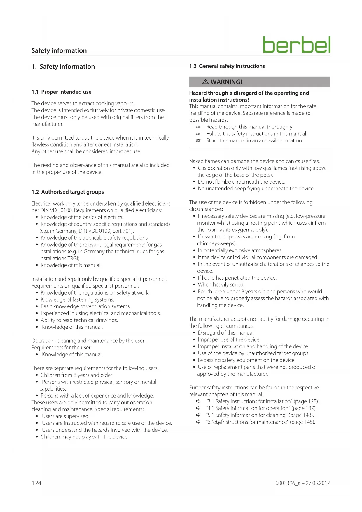 m WARNING! Hazard through a disregard of the operating and installation instructions! This manual contains important information for the safe handling of the device. Separate reference is made to possible hazards. Read through this manual thoroughly. Follow the safety instructions in this manual. Store the manual in an accessible location. Naked flames can damage the device and can cause fires. y Gas operation only with low gas flames (not rising above the edge of the base of the pots). y Do not flambé underneath the device. y No unattended deep frying underneath the device. The use of the device is forbidden under the following circumstances: y If necessary safety devices are missing (e.g. low-pressure monitor whilst using a heating point which uses air from the room as its oxygen supply). y If essential approvals are missing (e.g. from chimneysweeps). y In potentially explosive atmospheres. y If the device or individual components are damaged. y In the event of unauthorised alterations or changes to the device. y If liquid has penetrated the device. y When heavily soiled. y For children under 8 years old and persons who would not be able to properly assess the hazards associated with handling the device. The manufacturer accepts no liability for damage occurring in the following circumstances: y Disregard of this manual. y Improper use of the device. y Improper installation and handling of the device. y Use of the device by unauthorised target groups. y Bypassing safety equipment on the device. y Use of replacement parts that were not produced or approved by the manufacturer. Further safety instructions can be found in the respective relevant chapters of this manual. D “3.1 Safety instructions for installation” (page 128). D “4.1 Safety information for operation” (page 139). D “5.1 Safety information for cleaning” (page 143). D “6.1 Saf ety instructions for maintenance” (page 145).125 Product information 6003396_a – 27.03.2017