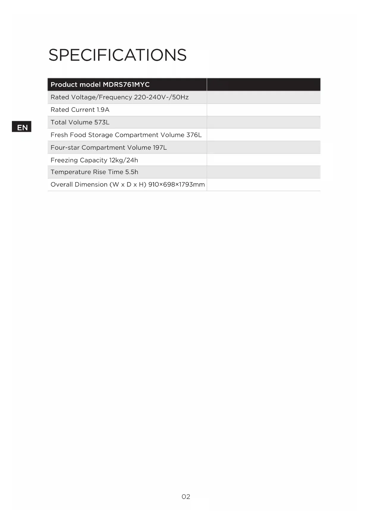 SPECIFICATIONS Product model MDRS761MYC Rated Voltage/Frequency 220-240V~/50Hz Rated Current 1.9A Total Volume 573L Fresh Food Storage Compartment Volume 376L Four-star Compartment Volume 197L Freezing Capacity 12kg/24h Temperature Rise Time 5.5h Overall Dimension (W x D x H) 910×698×1793mm03